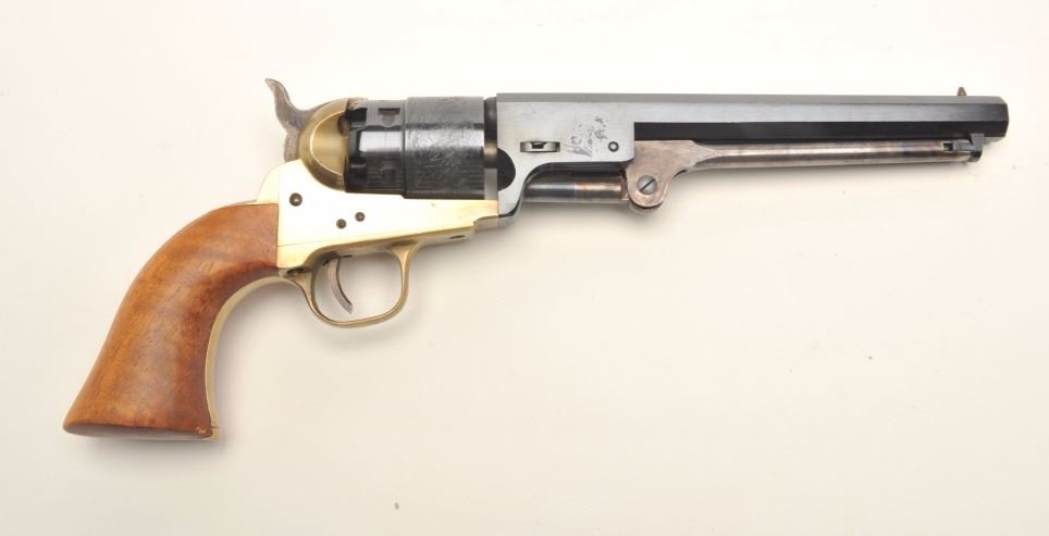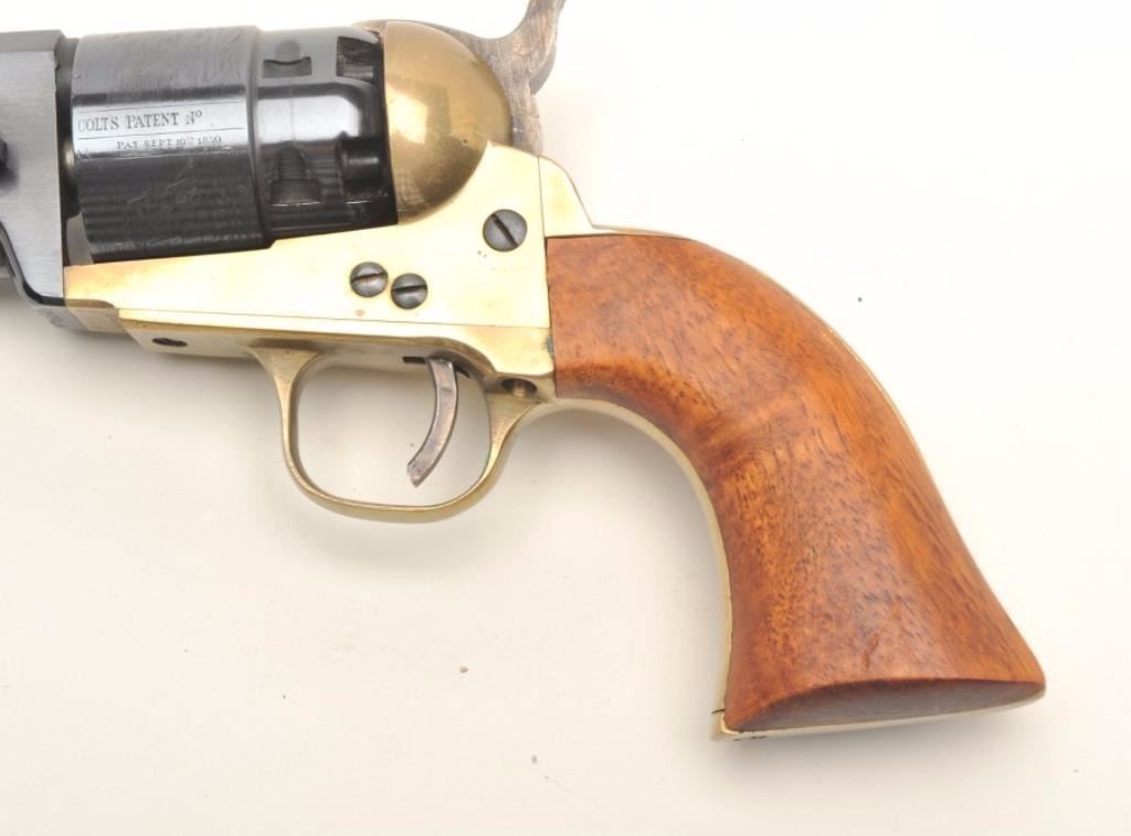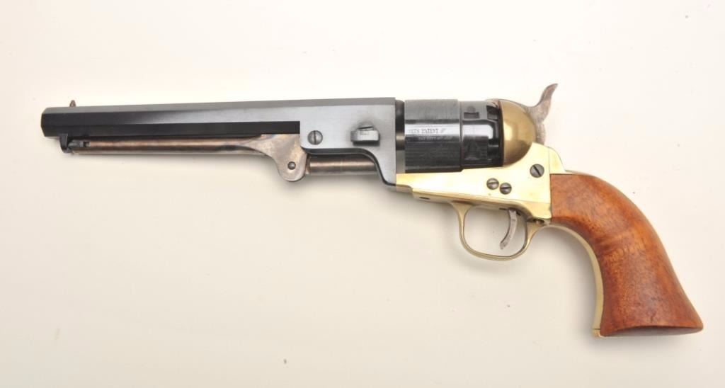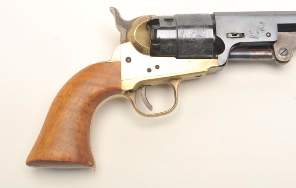ASM reproduction of a Colt 1851 Navy revolver, .45 caliber, serial #A13793. The pistol is in very good overall condition with a 7 1/2 “ barrel. The barrel and cylinder retain nearly all of their blued finish. The cylinder scene is very nearly 100% visible. The smooth wood grips are in very good condition with only slight handling marks. Est.: $100-$200.