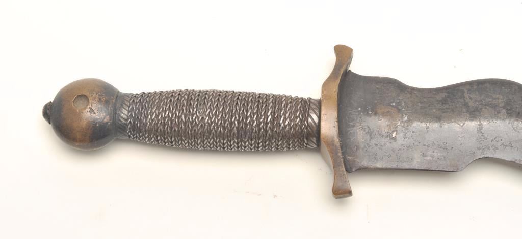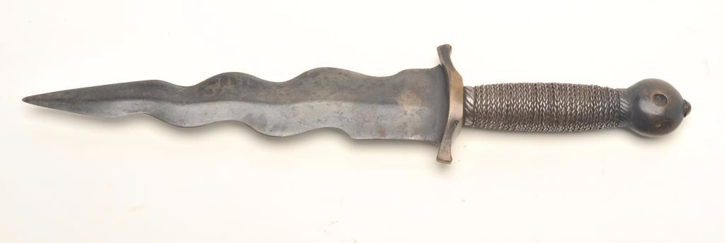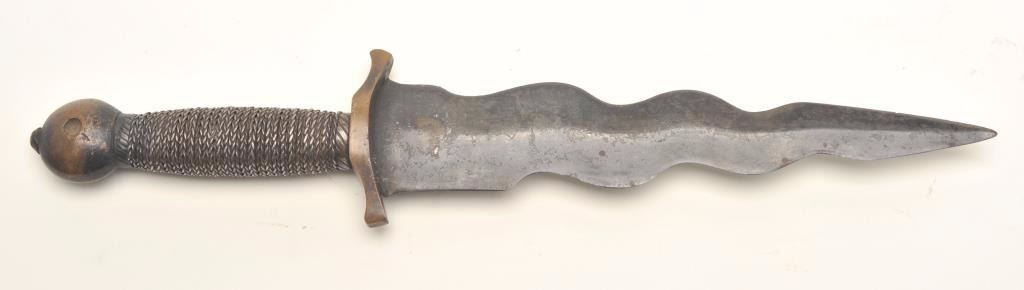 Composite wavy blade dagger, approximately 15.5” overall with a 10” blade; dark patina to brass top end; dark patina with scattered areas of erosion to blade. Est.: $100-$150.