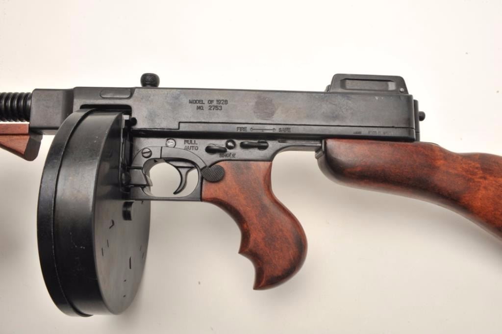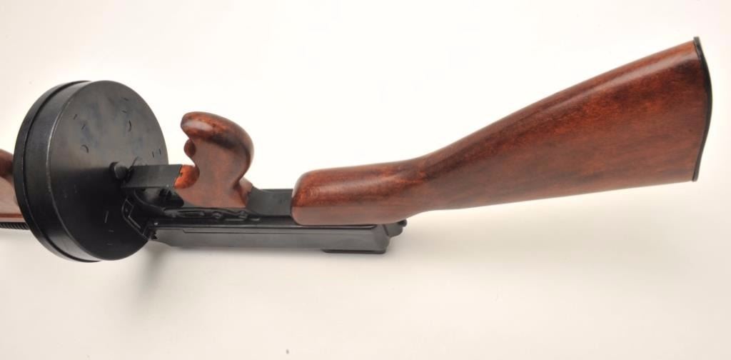 Thompson Model of 1928 prop gun. A faithful reproduction of a “Tommy Gun” with a drum magazine. This non-firing replica features all steel construction marked, “MADE IN SPAIN”. The fore end, pistol grip and buttstock are all wood showing nice figure. A great piece for the re-enactor. Est.: $100-$200.