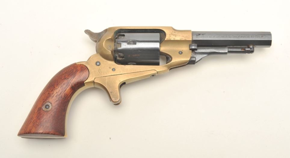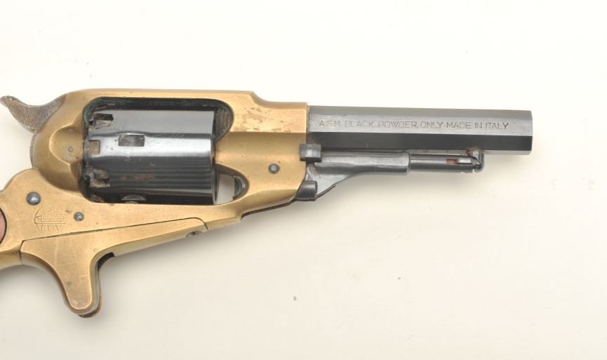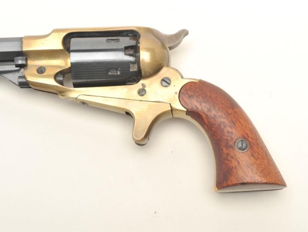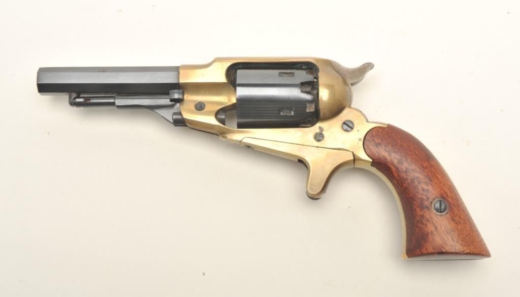 Connecticut Valley Inc. reproduction percussion pistol. The pistol is in overall very good condition with a 3 ½” octagon barrel. The barrel and cylinder retain the majority of their blued finish while theremainder of the pistol is brass. The pistol is not caliber marked but is approximately .32 caliber. The smooth wood grips are in very good condition. Est.: $100-$200.
