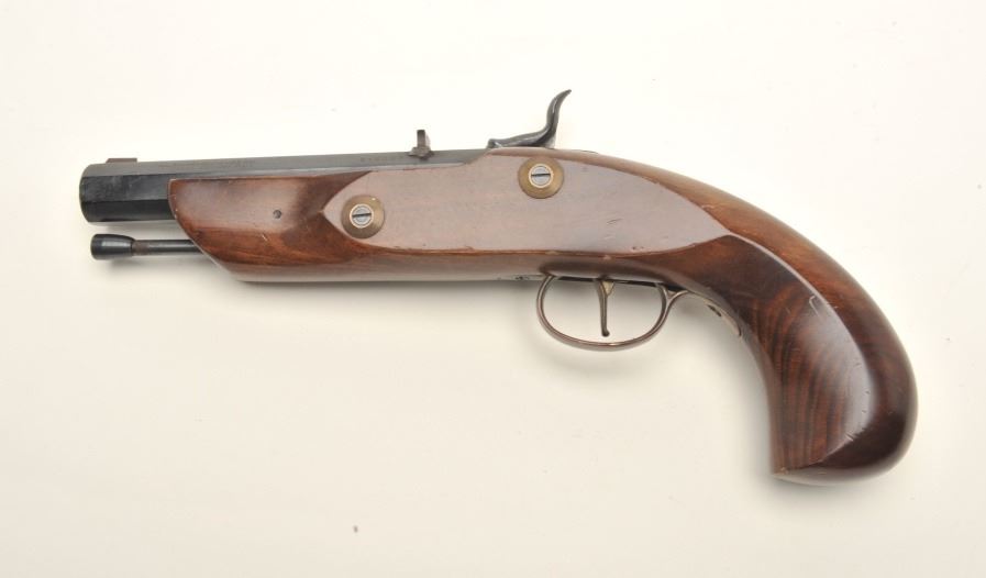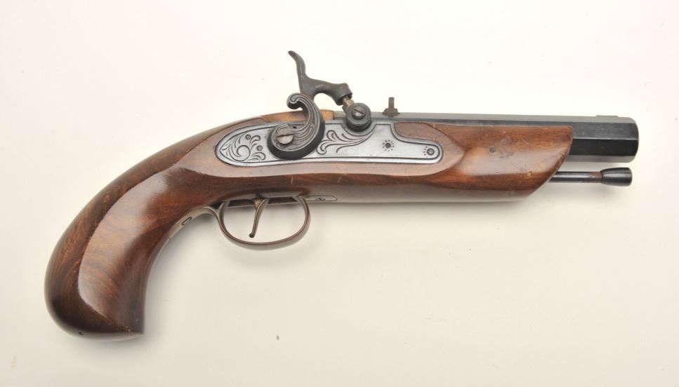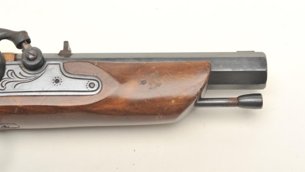 Spanish Ardesa black powder percussion pistol, approximately .45 caliber, serial #010963. The pistol is in very good overall condition with a 6” octagon barrel. The barrel retains the majority of its bluedfinish. The smooth wood stock is in good condition with small handling marks. Est.: $50-$100.