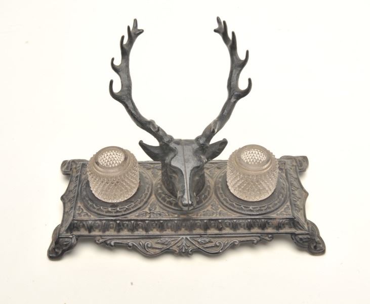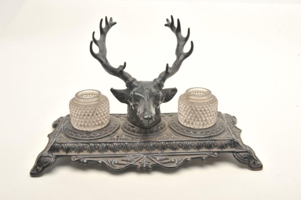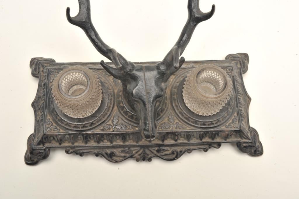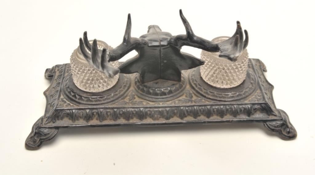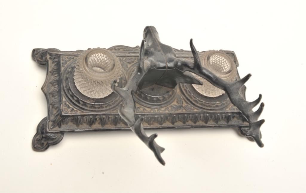 Antique metal double ink stand with two glass inserts; approximately 5.5” in height, 10” wide and 5” deep at the base; majority of black paint remaining; marked “B&H” & “6013” on bottom of base. Est.: $50-$100.