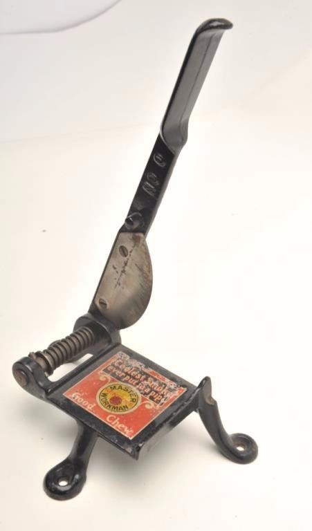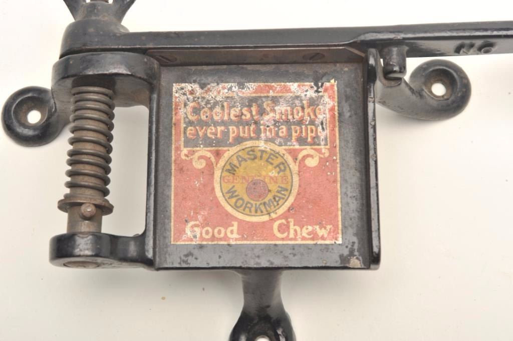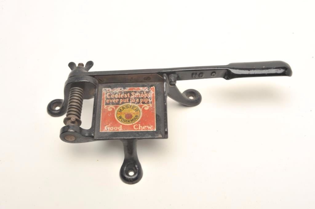 Antique small metal tobacco plug cutter, marked “16031” on the underside of base, “No 0” on the handle with original label on top side of base “Coolest Smoke ever put in a pipe/Master Workman Genuine/Good Chew”;approximately 2” in height, 12” long and 6” wide; overall good condition. Est.: $50-$100.