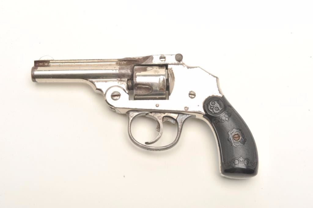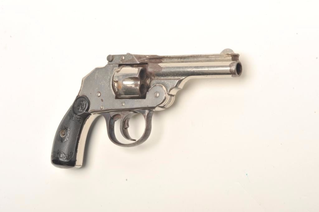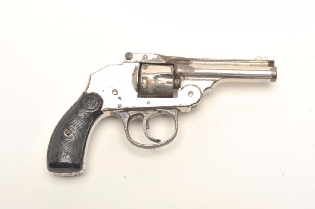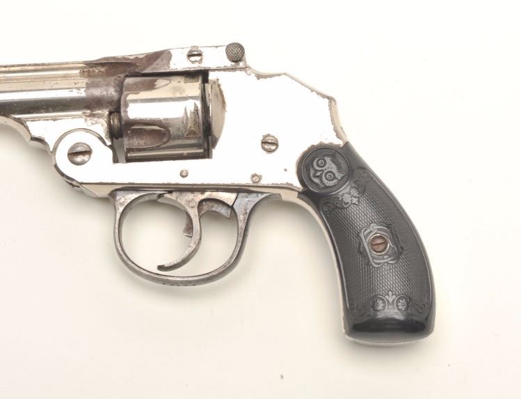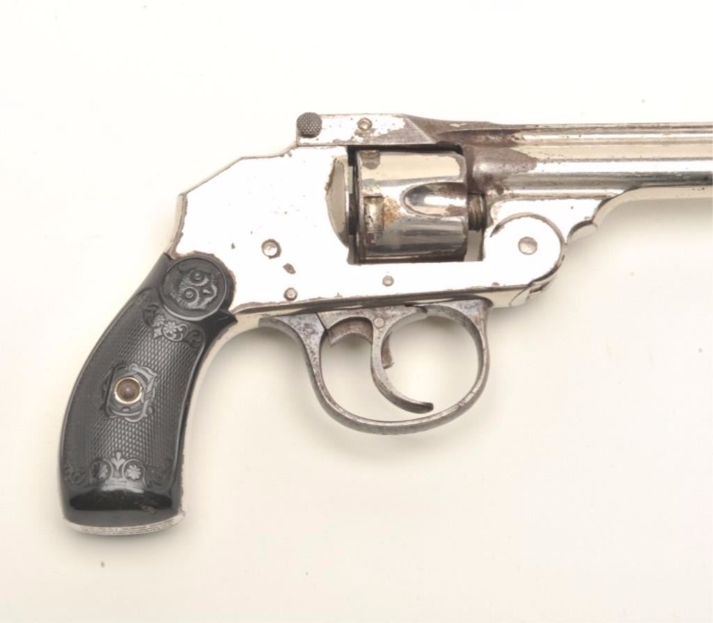 Lot 684 Iver-Johnson top break DA hammerless revolver, .32 caliber, 3” barrel, nickel finish, checkered ow