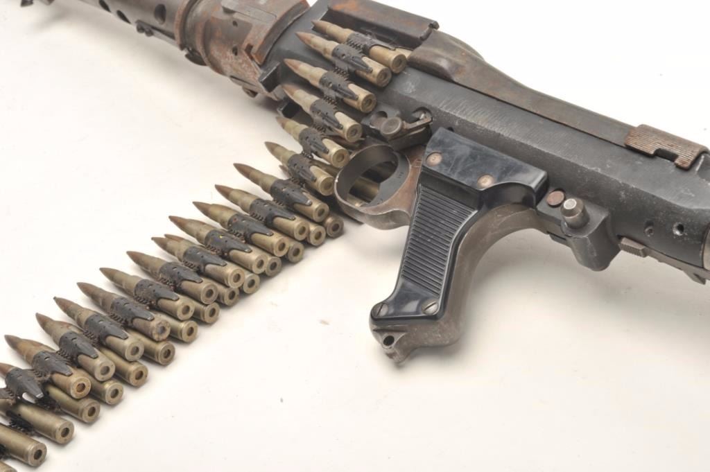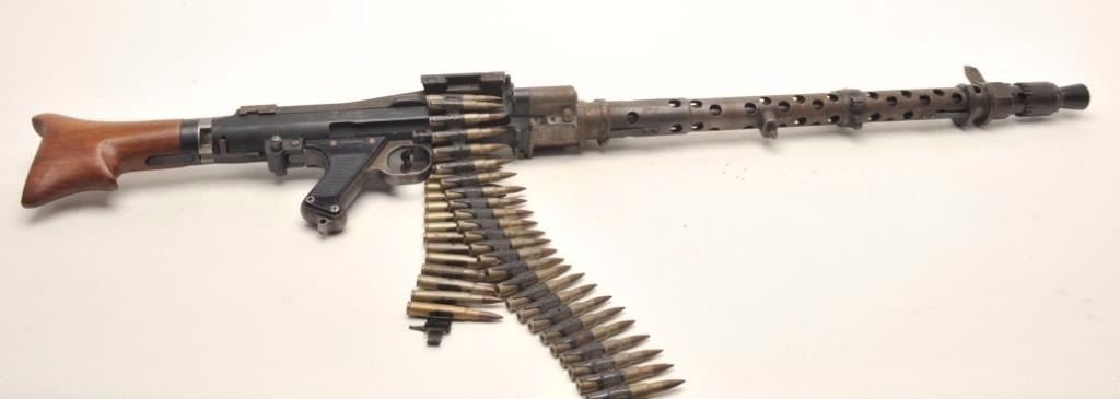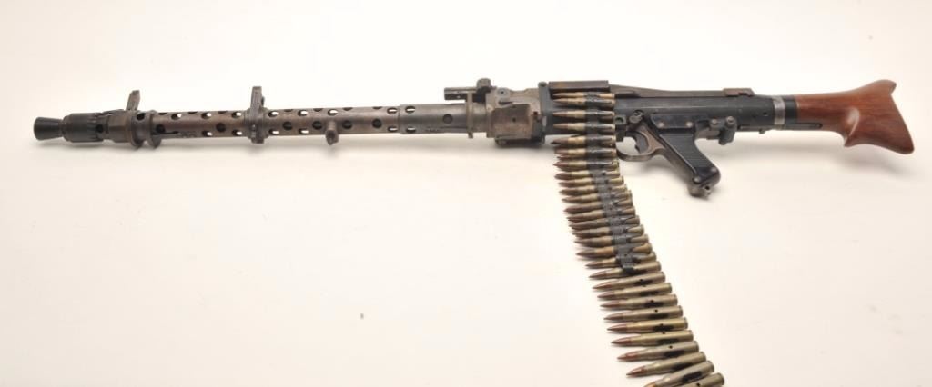 German MG 34 prop gun. A non-firing replica of the famous World War II German machine gun. The MG 34 was a recoil-operated, air-cooled machine gun first introduced in 1929 and generally considered the world’sfirst general purpose machine gun. The metal surfaces show light rust but it is otherwise in very good condition. This replica is 47” in total length and weighs nearly as much as the original at almost 27 pounds. The propgun also features linked dummy rounds. A great tool for the re-enactor. Est.: $300-$600.