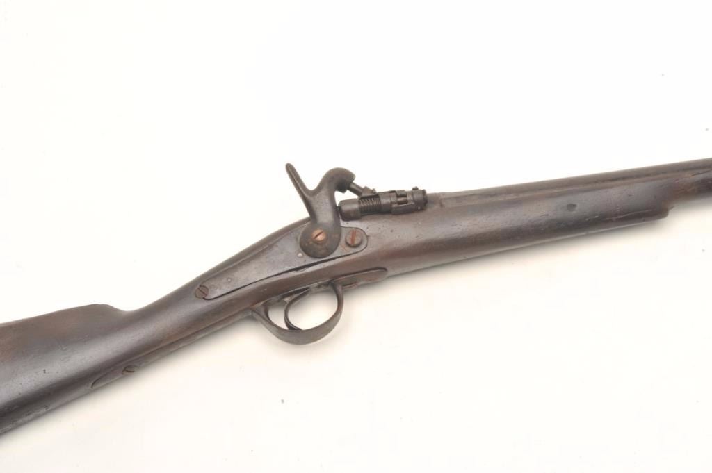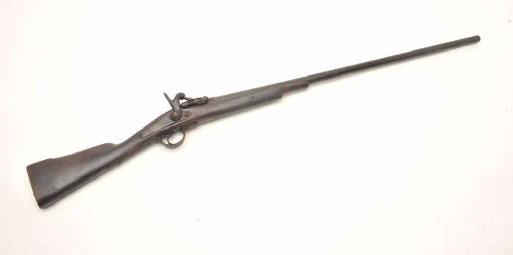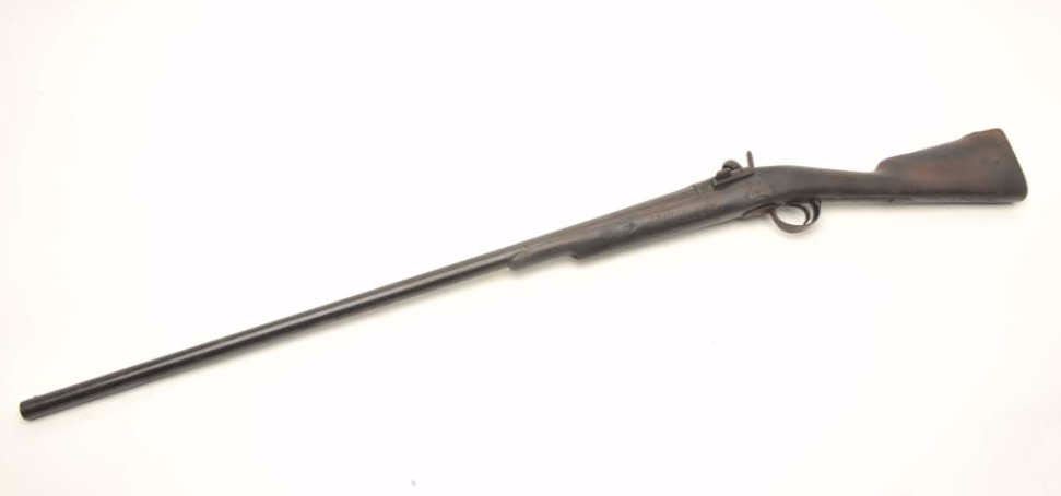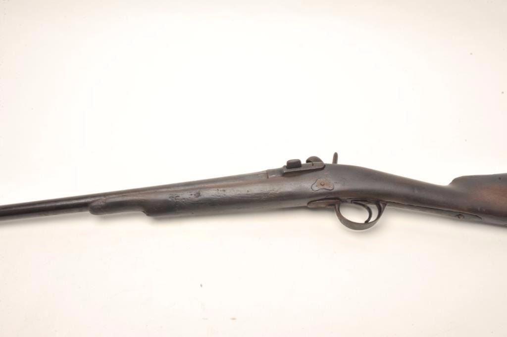 Zulu style percussion shotgun, 10 gauge, serial #1935. The shotgun is in fair overall condition with a 34” barrel. The barrel and receiver have entirely to a dark brown patina with significant surface rust anderosion. The barrel is marked “HUNTER” forward the breech and several European proofs are noted. The smooth wood stock has seen heavy use with dents, mars and compressions. The butt stock is completedwith a smooth iron butt plate. The ramrod is missing from the stock as well. Est.: $75-$150. Antique