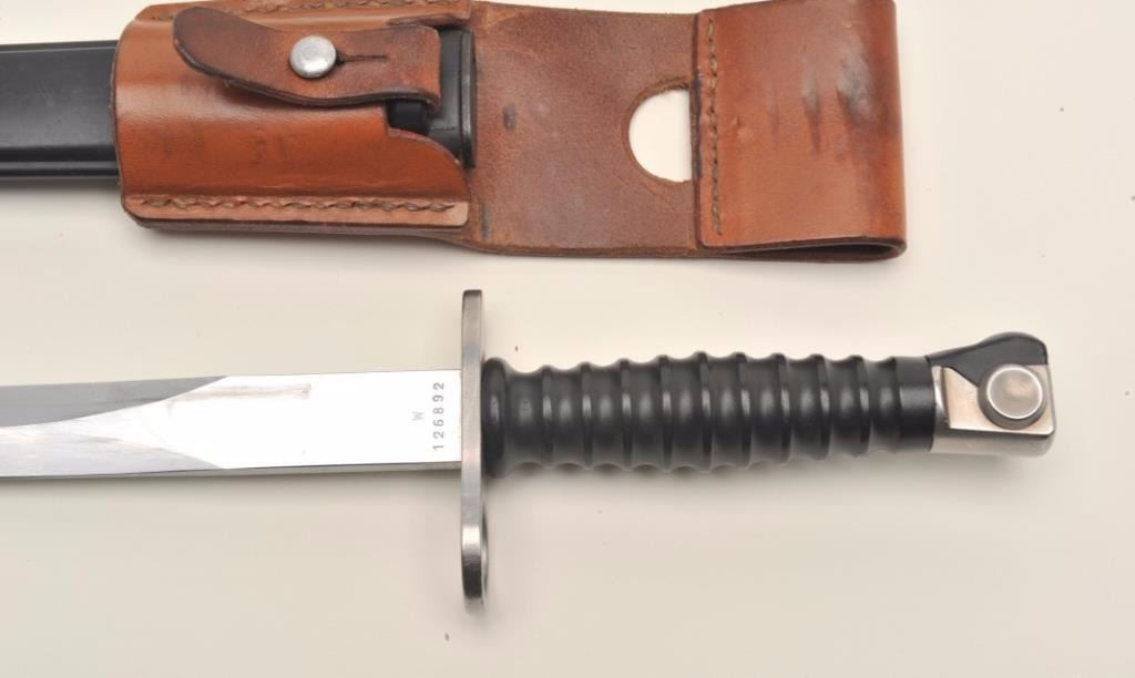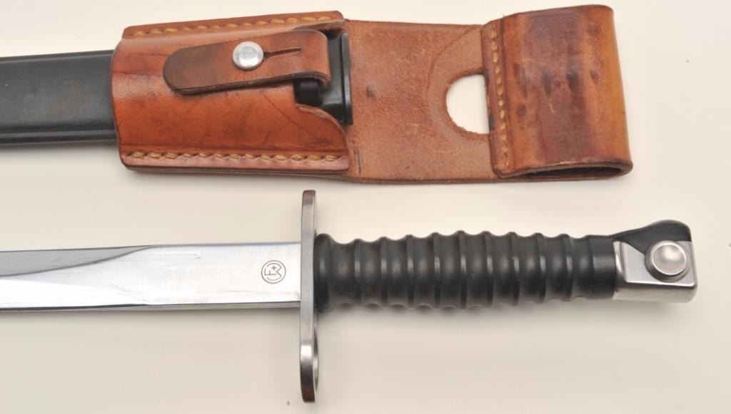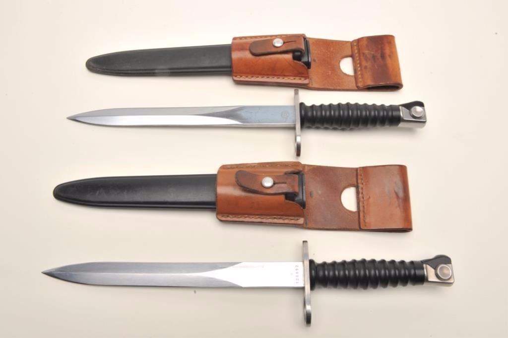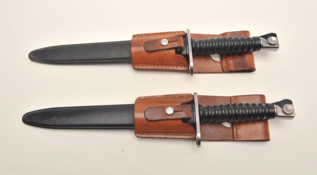 Lot of 2 Swiss bayonets with sheaths and leather hangers, both in very good to fine condition; at base of blades, one is marked “VICTORIA SCHWYZ”, the other marked with an F+W inside a circle. Est.: $75-$150.