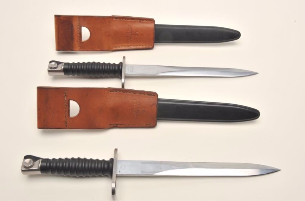 Lot 709 Lot of 2 Swiss bayonets with sheaths and leather hangers, both in very good to fine condition; at