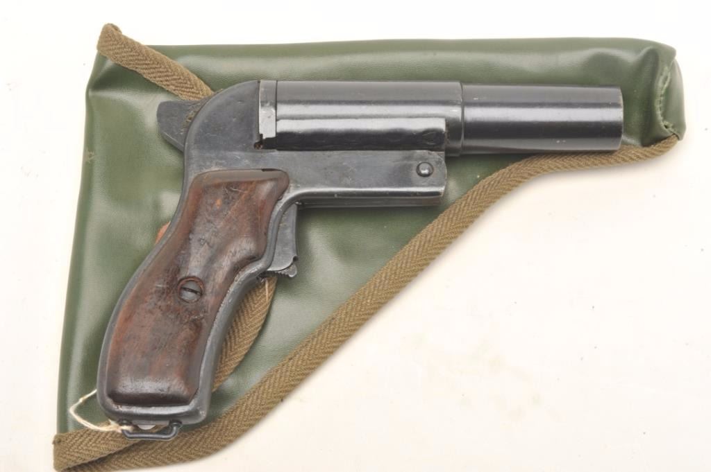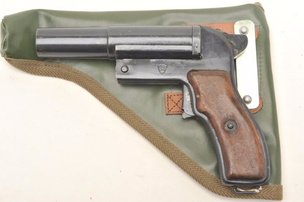 Soviet flare pistol, 26.5mm caliber, blued finish, wood grips, approximately 9” overall, no visible S/N, overall very good condition, strong action, very good grips; accompanied by Capture Papers from Vietnam War indicating returning GI was assigned to the 1st Air Cavalry. Est.: $100-$200.