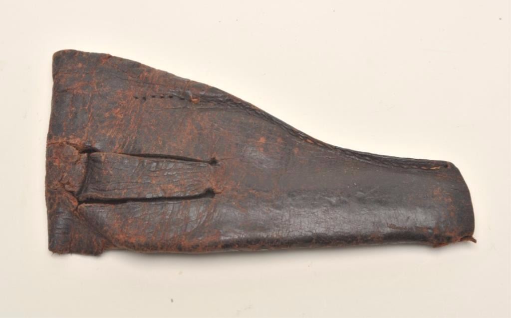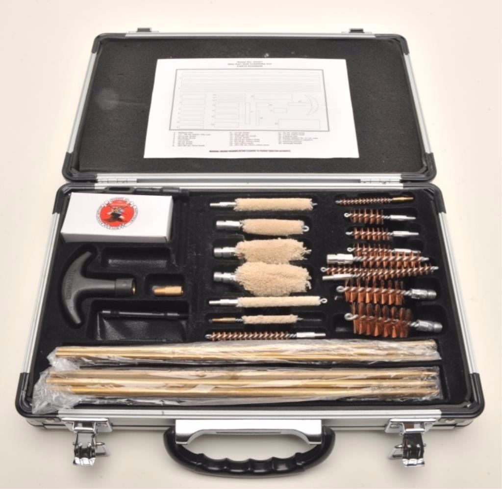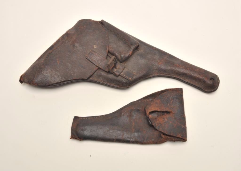 Lot of 3 items including large leather flap holster with attached magazine pouch in well-worn condition; a small leather flap pouch, also in well-worn condition and an NRA metal hardcase with cleaning rods, brushes,etc. Est.: $100-$200.