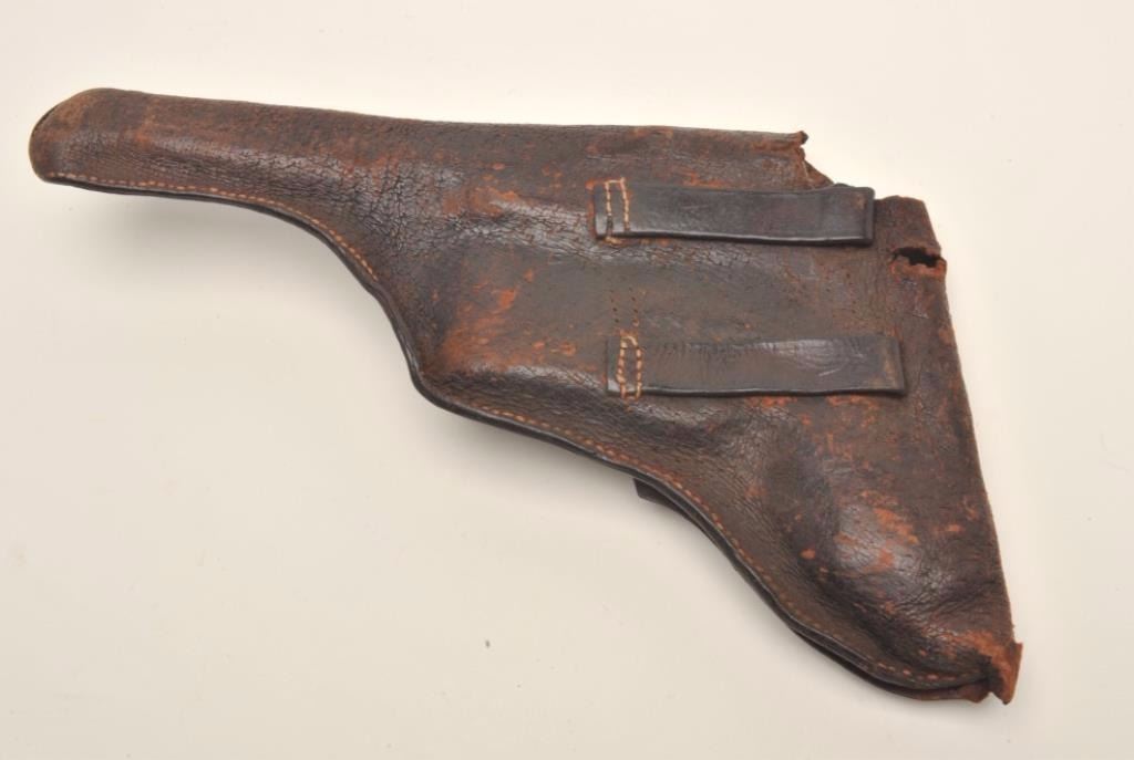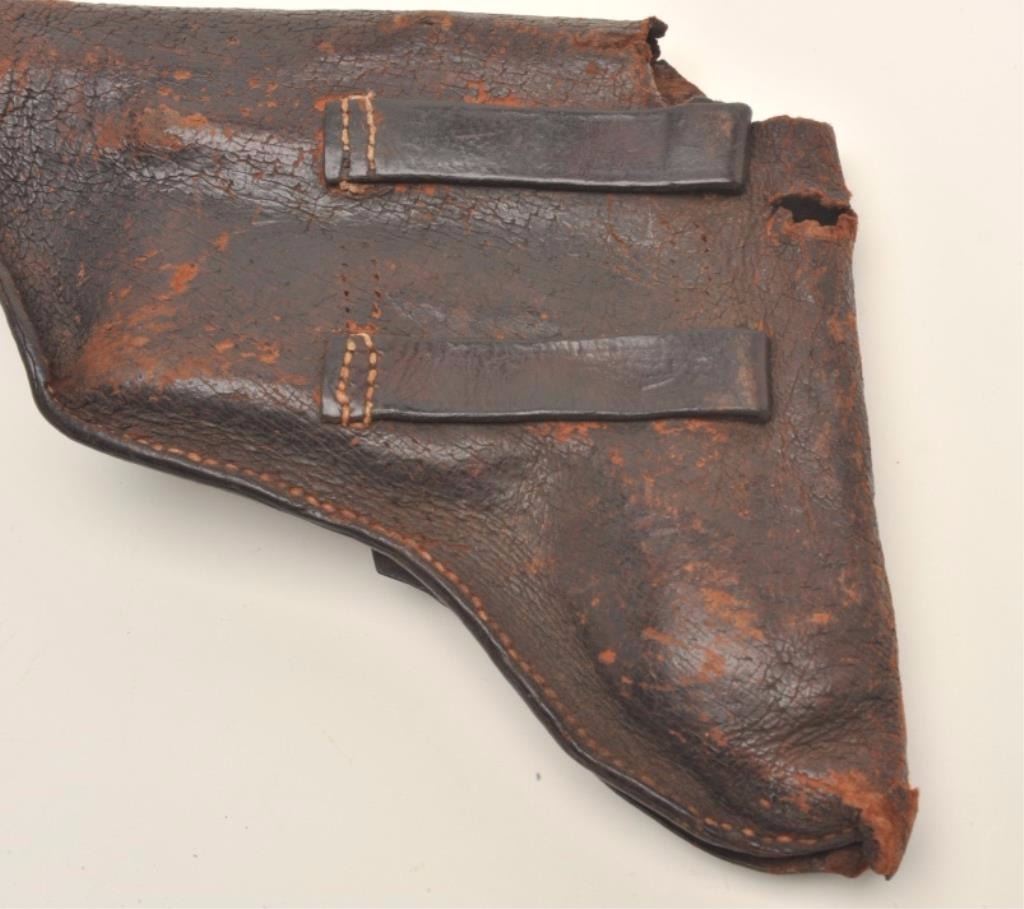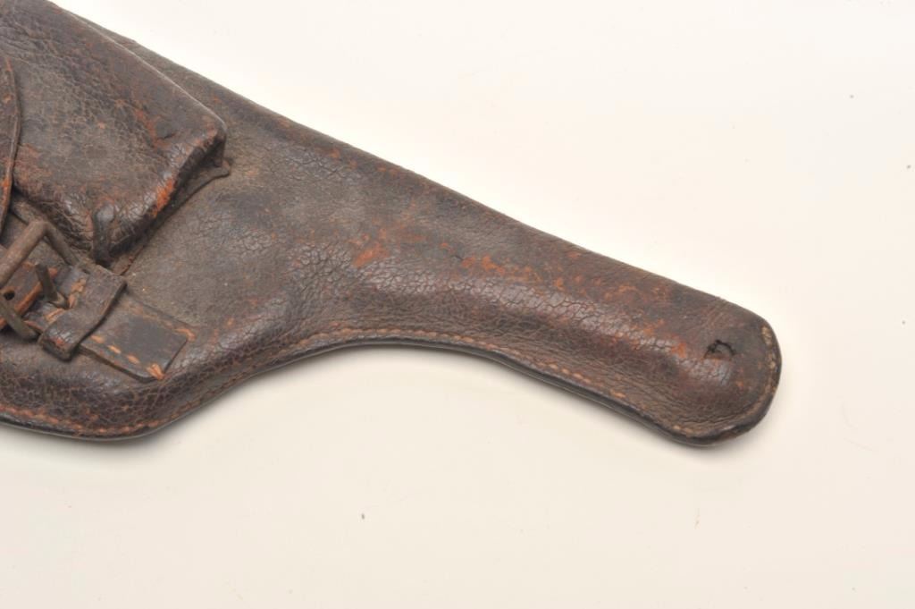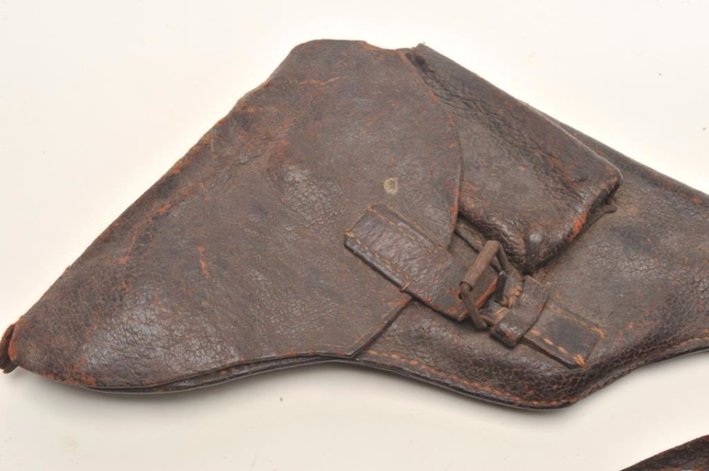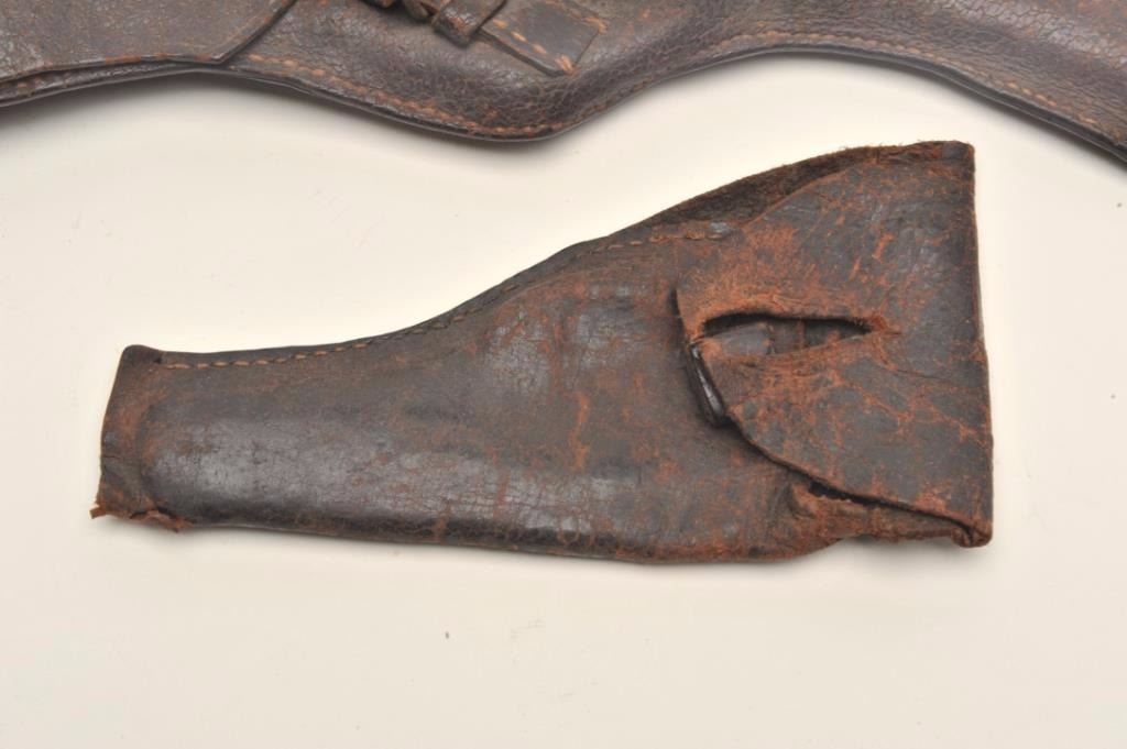 Lot 715 Lot of 3 items including large leather flap holster with attached magazine pouch in well-worn cond
