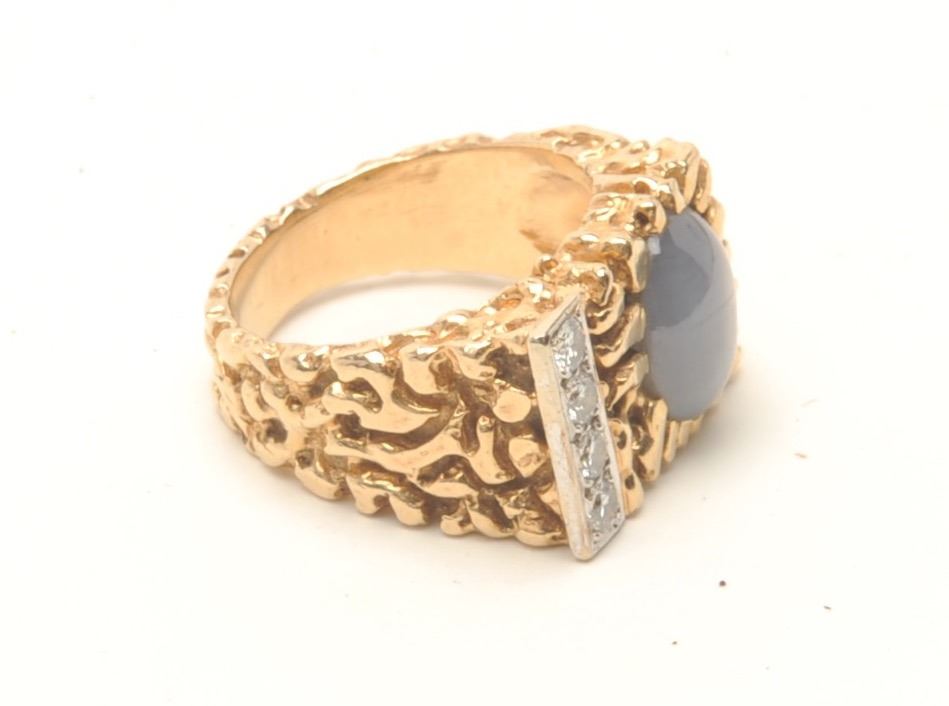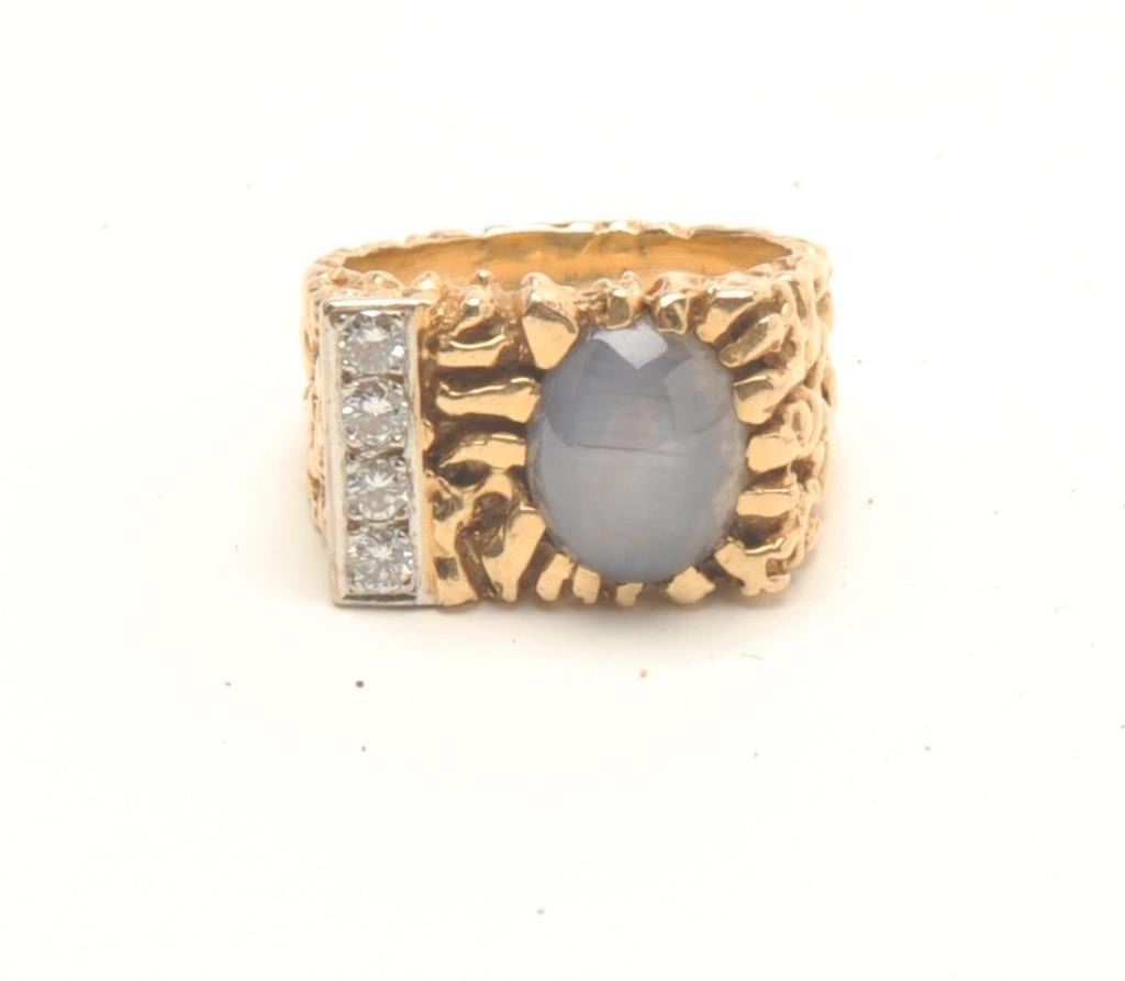 Lot 762 Gray Sapphire ring with four 8 to 12 point diamonds of good color in wrought gold custom mount; 14