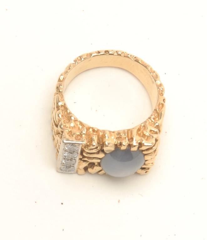 Gray Sapphire ring with four 8 to 12 point diamonds of good color in wrought gold custom mount; 14K (weighs 10 DWT – ½ oz.). 1970’s cost approximately $1,200. Est.: $350-$700.