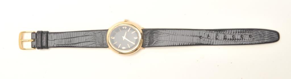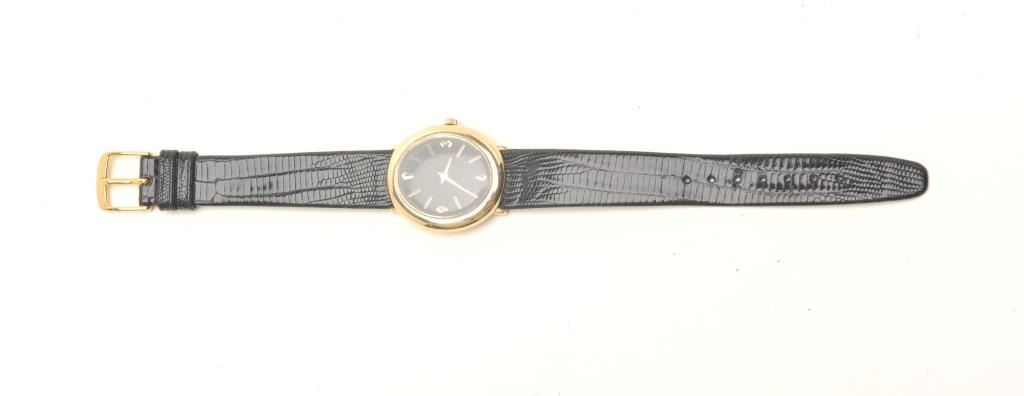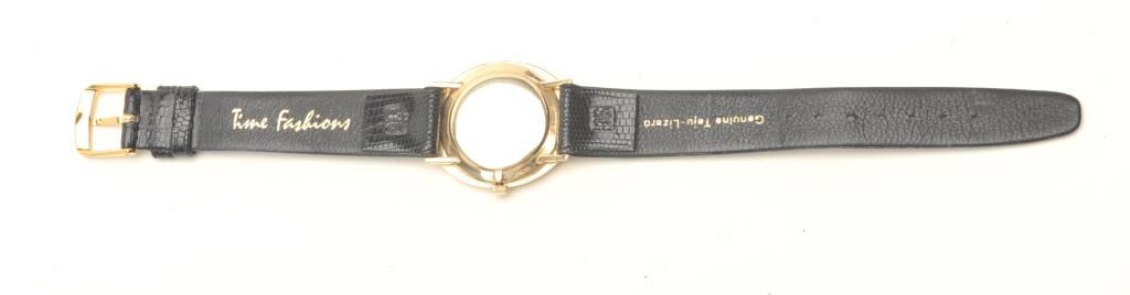 Wristwatch with oblong or ovoid shaped case, marked â14Kâ; mechanical movement purchased in 1968 Beverly Hills by our consignor as a Swiss watch; Time Fashions Lizard band; not running at time of description. Est.:$400-$800.
