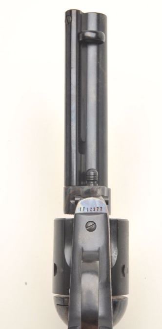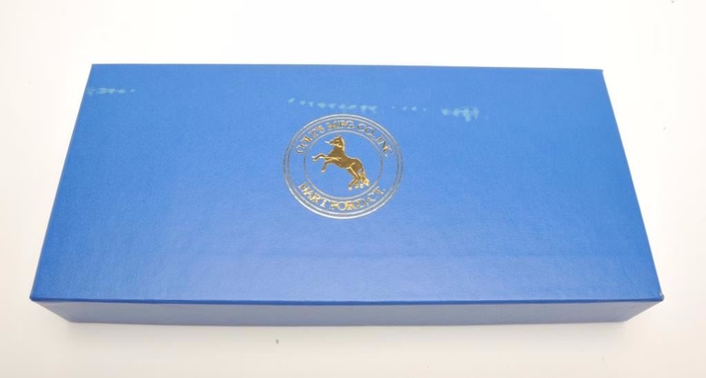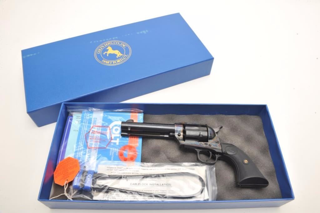 Colt Cowboy SAA revolver, .45 caliber, 4.75” barrel, blued and case hardened finish, checkered hard rubber grips, S/N TF12377, in like new condition showing little handling and contained in a two piece blue factorycardboard box with instruction and hang tag; also included is factory shipping cardboard sleeve with end label numbered to this revolver. (Modern/PPT). Est.: $700-$1,400.