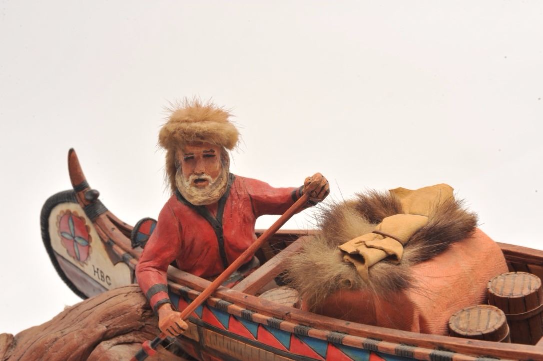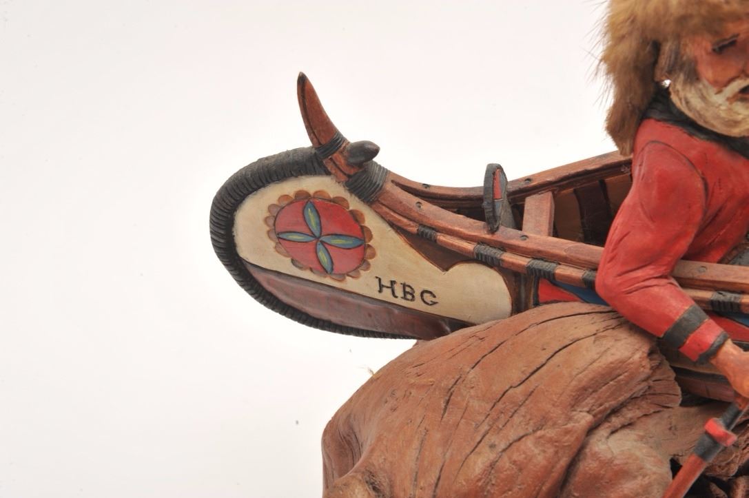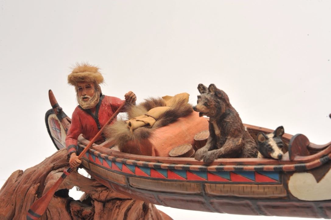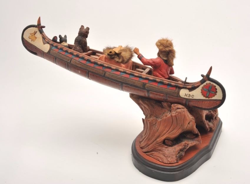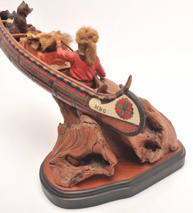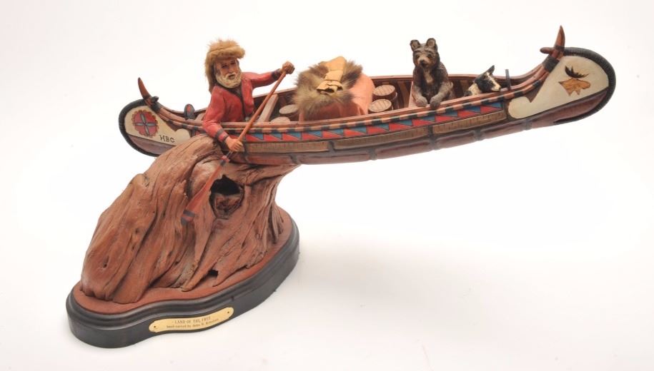 Hand carved wood sculpture entitled “Land of the Free” by John H. Kittleson. Portrays a trapper in a canoe. Superb detail. Measures 12 ½” in height by 27” not including the base. Kittleson was born in 1930 and is oneof the first 15 artist admitted to Cowboy Artist of America. He is among the best artists ever to work in this medium. Est.: $800-$1600