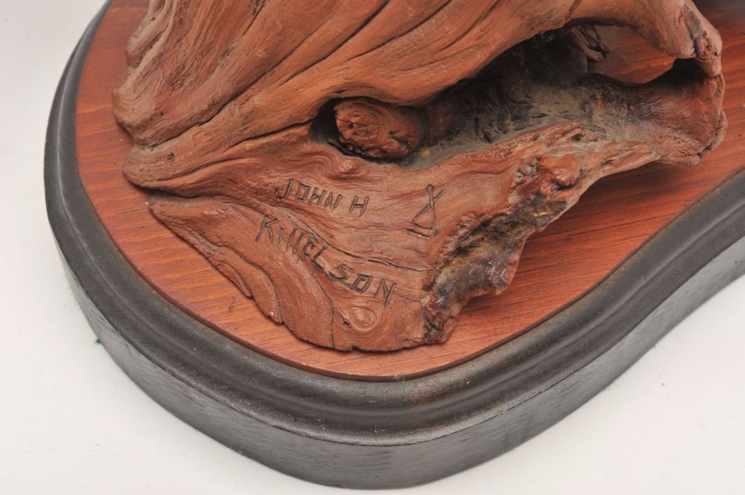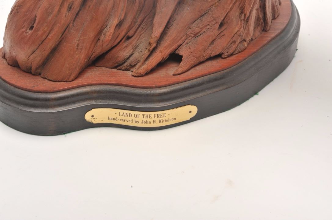 Lot 810 Hand carved wood sculpture entitled “Land of the Free” by John H. Kittleson. Portrays a trapper in