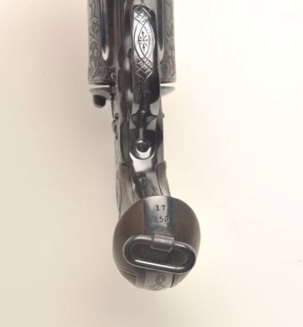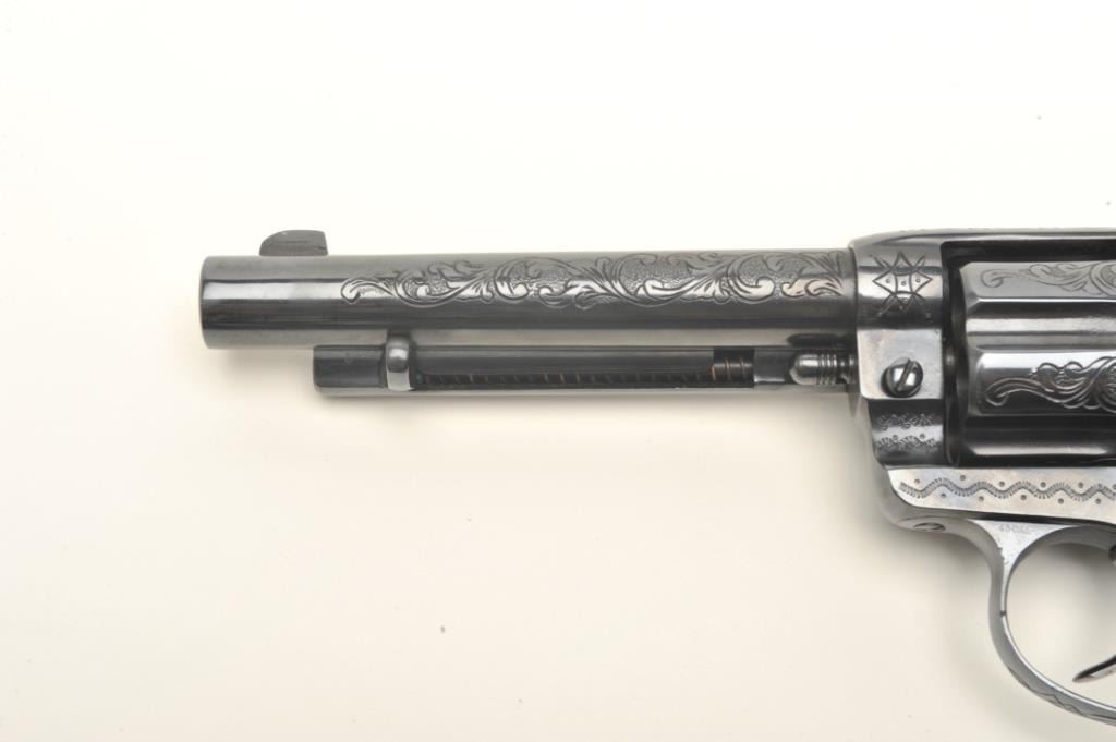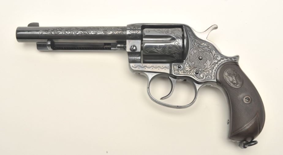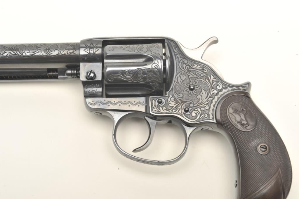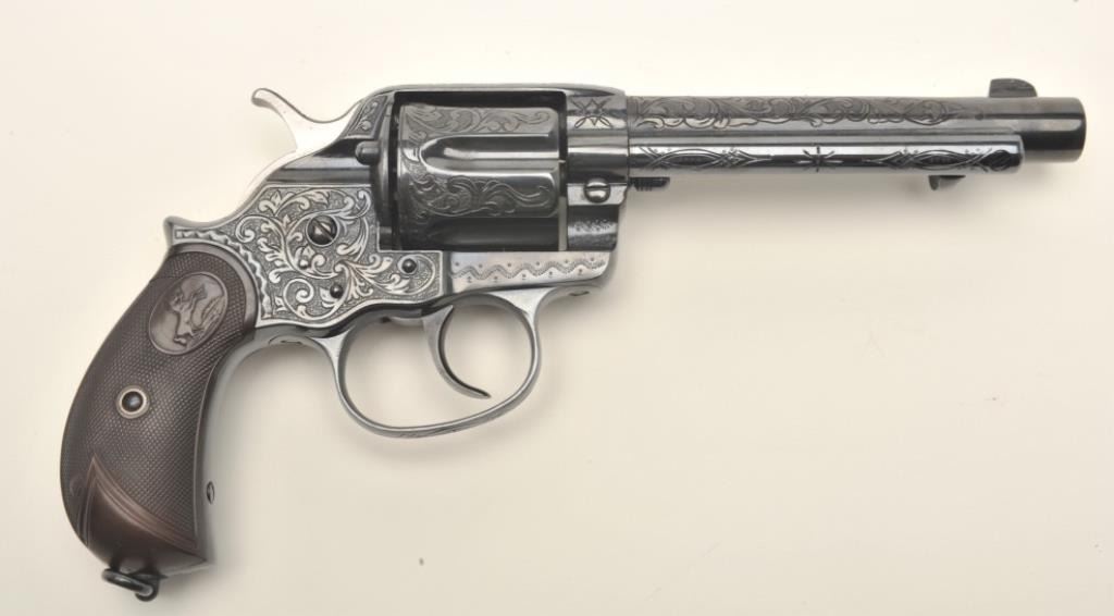 Colt Model 1878 DA revolver, engraved (non-factory), re-blued finish, checkered black hard rubber grips, S/N 17350, in overall very good condition as custom engraved and re-finished; good bore, crispaction and markings, very good grips. (Antique). Est.: $1,500-$3,000.