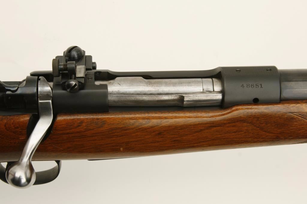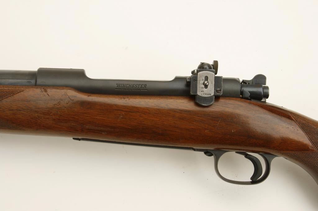 Winchester Model 70 (pre-64) bolt action rifle, .220 Hornet caliber, 24” barrel, blued finish, checkered wood stock with Livermore and Meyers hard rubber butt pad, S/N 48651, in overall very good to fine condition,receiver and barrel tapped for scope mount, Lyman adjustable receiver mounted sight with hooded front sight, fine bore, crisp action, sharp markings and overall very good wood showing handling and scattered old mars andscratches from carry and storage. (C&R). Est.: $1,250-$2,500.