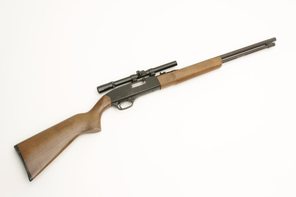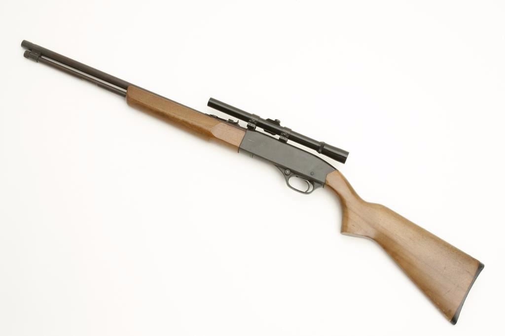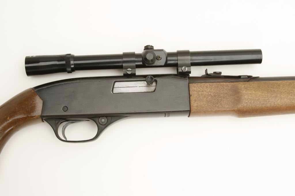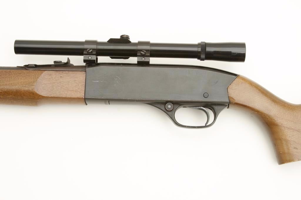 Winchester Model 190 semi-automatic rifle, .22 Long or Long Rifle caliber, serial #B2013773. The rifle is in good overall condition with a 20” barrel. The front sight has been removed from its dove tail with the rear sight retained. The barrel and full-length magazine show significant blued finish while the receiver has scuffs and scratches noted to the finish. The smooth wood stocks are in good condition showingmoderate wear and use with small scrapes, compressions and loss of finish to the fore end. The bore is good, the action functions and the markings are legible. The rifle is topped with a Simmons 4 x 15 fixed powerscope. (Modern) Est.: $125-$250.
