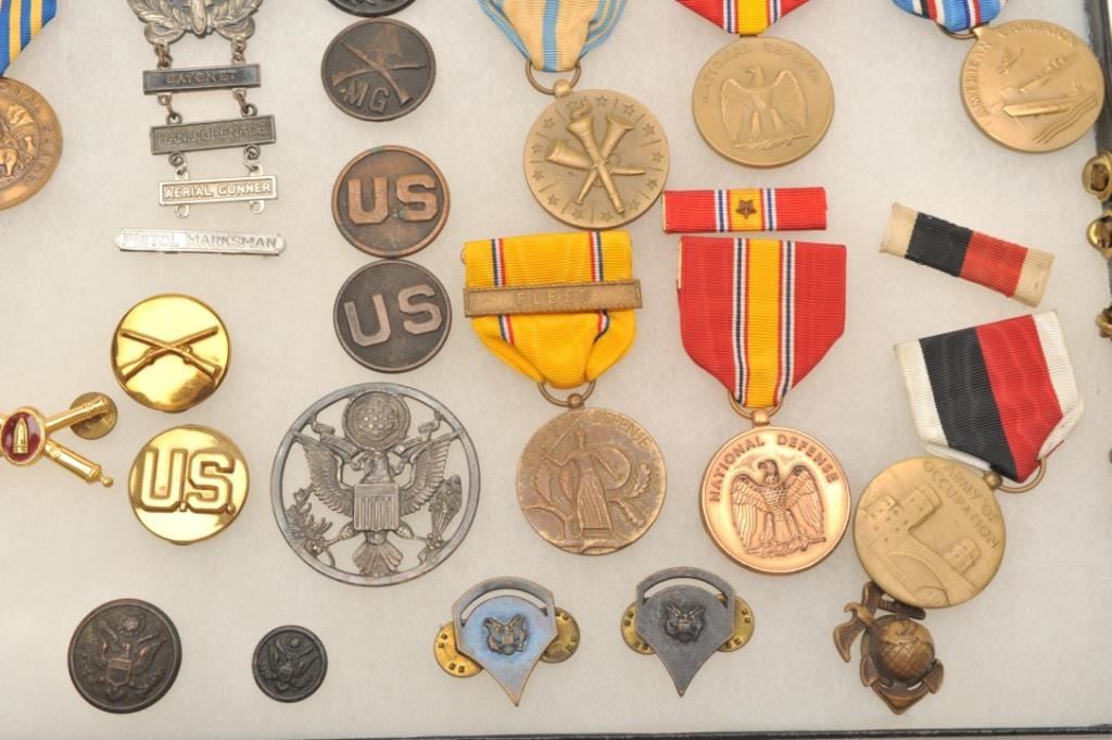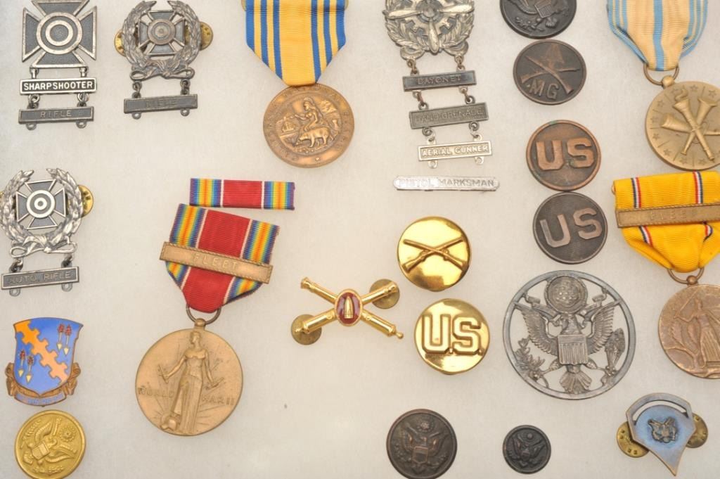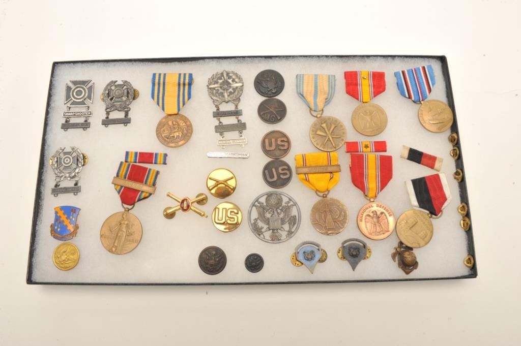 Riker case of approximately 28 U. S. military medals, buttons, ribbons, etc. including a Calif. Nat’l Guard medal, Fleet medals, Nation Defense metals, etc. plus sharpshooter rifle and auto rifle medals, a Machine gunbutton and a aerial gunner medal with hand grenade and bayonet bars included. Est.: $150-$300.