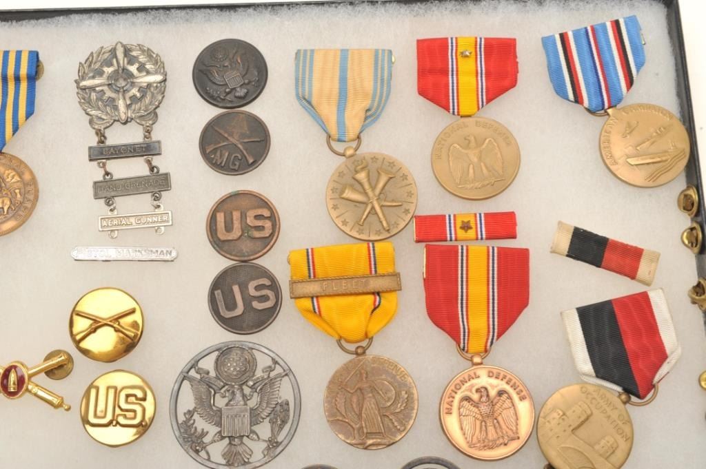 Lot 930 Riker case of approximately 28 U. S. military medals, buttons, ribbons, etc. including a Calif. Na