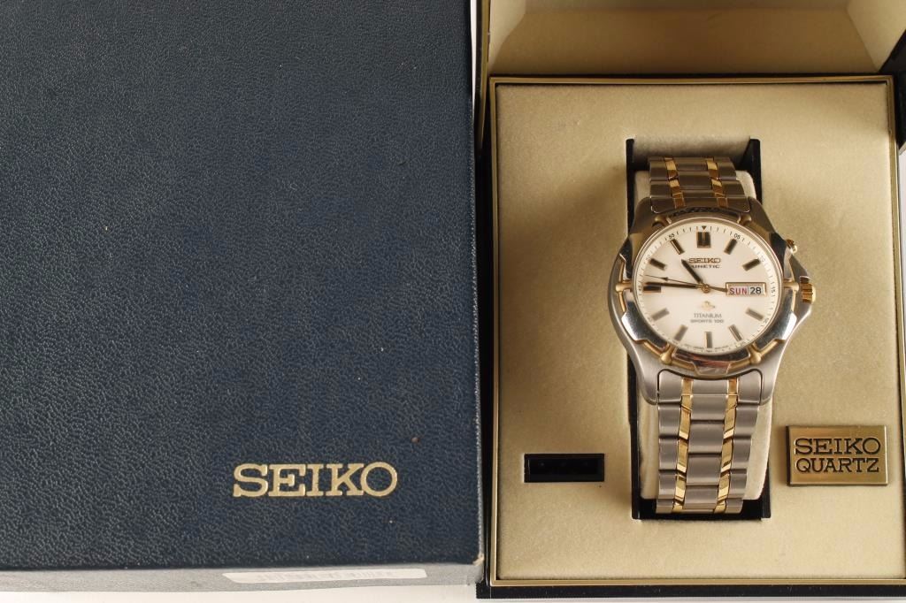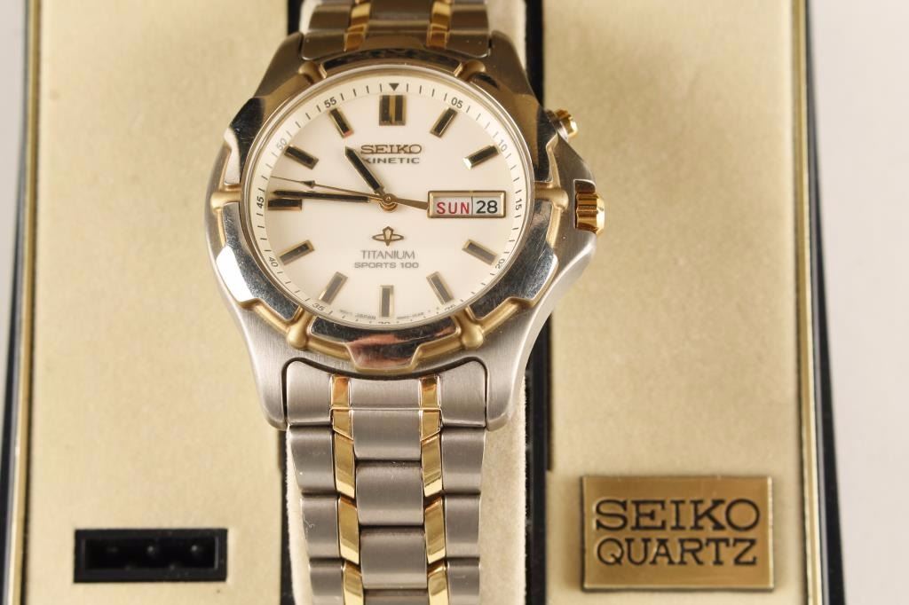 Seiko Kinetic Titanium Sports Model 100 watch. The watch is in overall excellent condition showing little, if any use. In the original box with packing material and extra links, this gold tone and brushed titaniumfinished watch is ready to go. Est.: $200-$400.