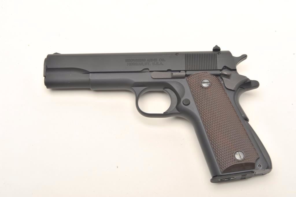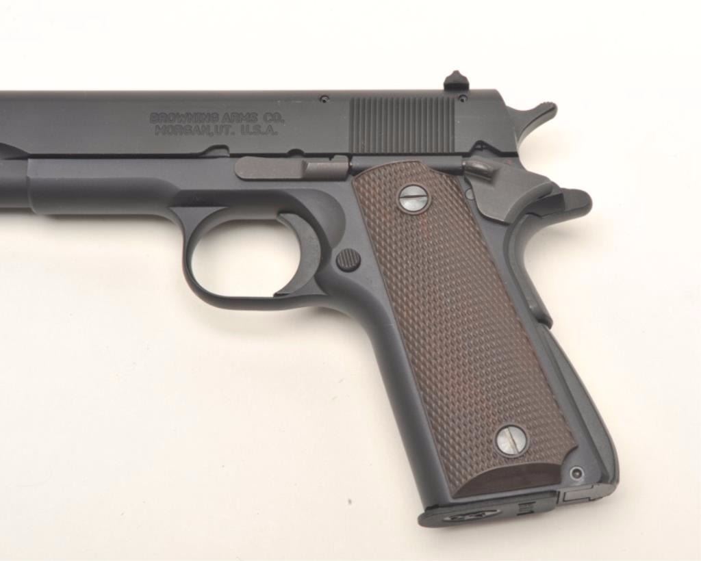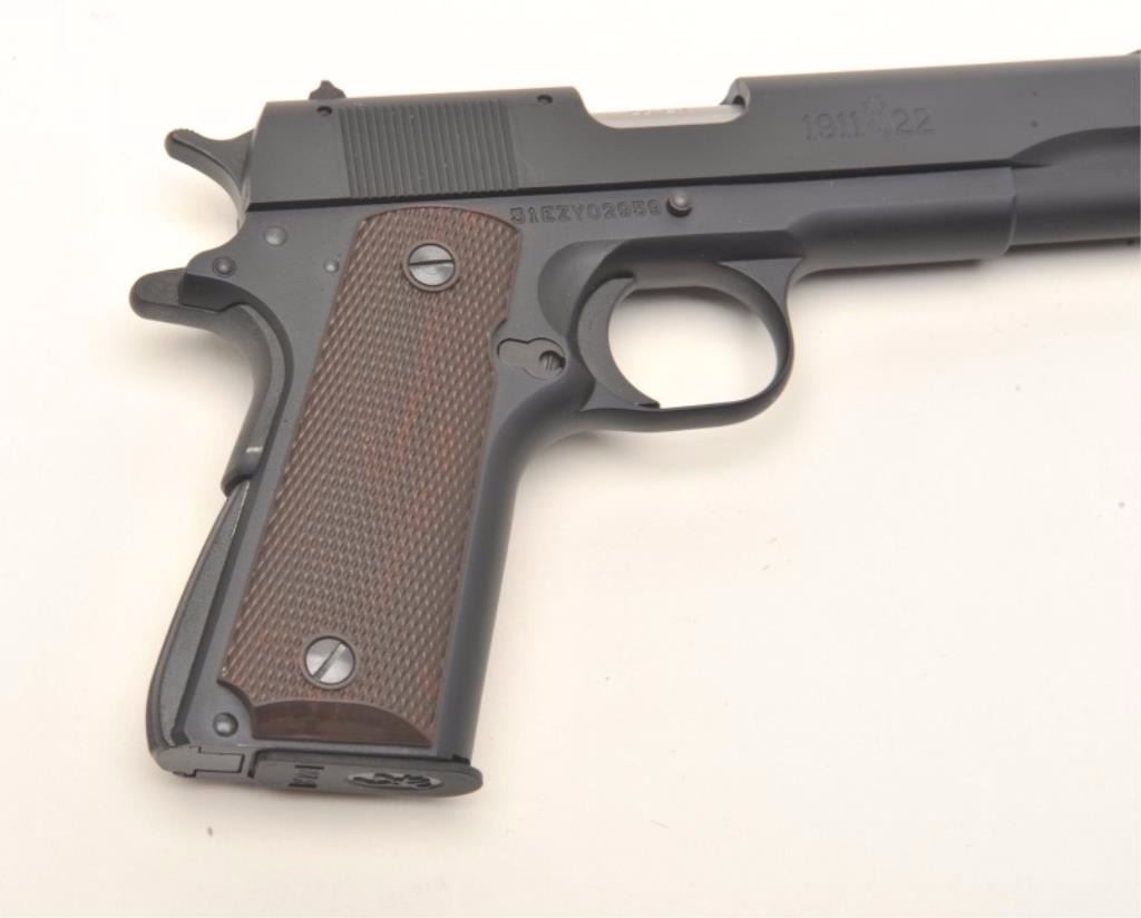 Browning 1911-22 Baby 1911 semi-automatic pistol, #51EZY02959. Matte black finish, plastic checkered grips, 90% frame size for smaller shooters. Pistol is in excellent condition, with original paperwork, Browningboot, gunlock, cardboard box and 1 magazine. Est. $300-600. (Modern, PPT)