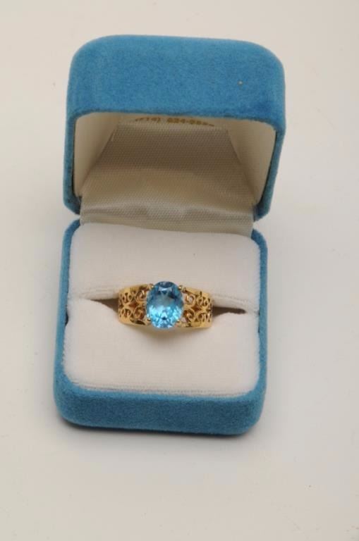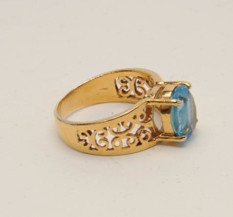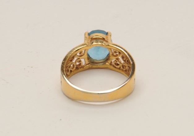 One Swiss blue oval topaz weighing approx 6ct set in an ornate filigree 14k yellow gold mounting. Est. $300-$600.