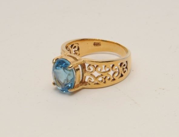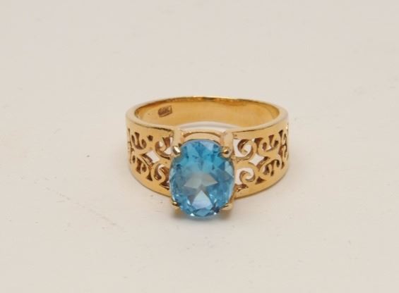 Lot 974 One Swiss blue oval topaz weighing approx 6ct set in an ornate filigree 14k yellow gold mounting.