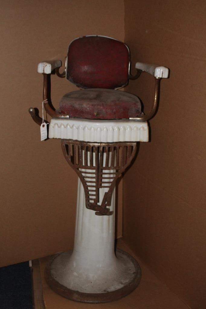 Child’s barber chair circa 1970’s to 40’s. Broken arm. Complete and needs restoration. Ex Harlod’s Club collection. Est.: $300-$600