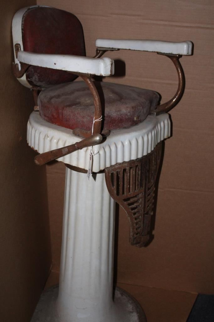 Lot 982 Child’s barber chair circa 1970’s to 40’s. Broken arm. Complete and needs restoration. Ex Harlod’s