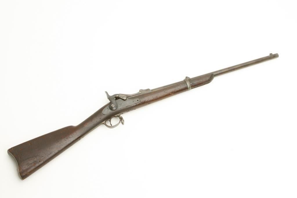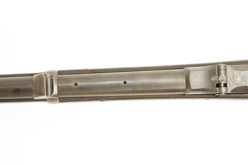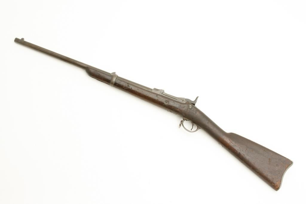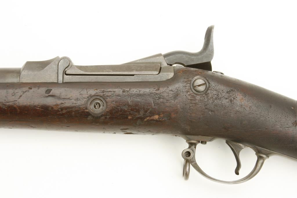 Springfield .45-70 trapdoor shortened to carbine length, S/N 335579. Most likely for re-enactor or media production. No rear sight. Fair only. Broken and repaired at the wrist. Good bore. No saddle ring bar or ring. Lock screw I missing. (Antique) Est.: $250-500