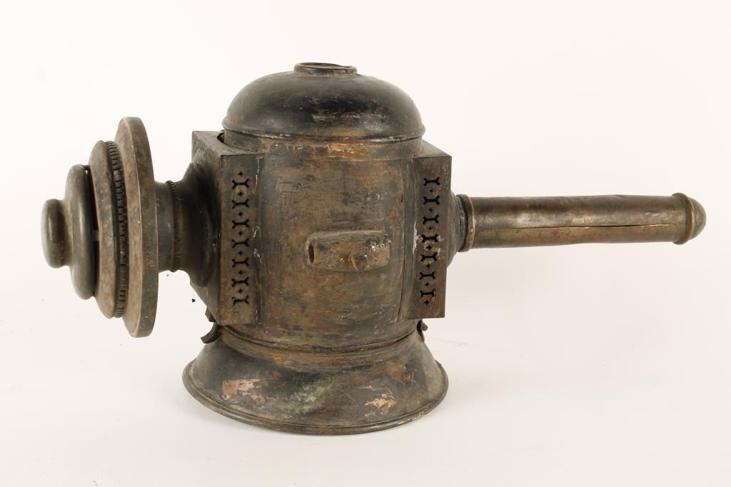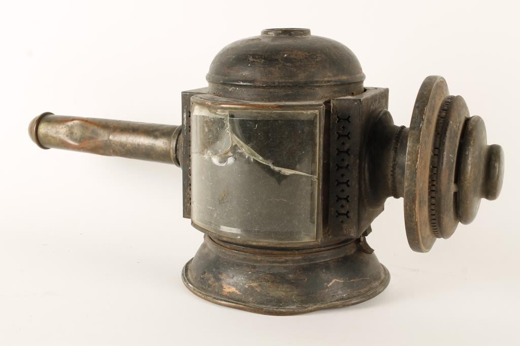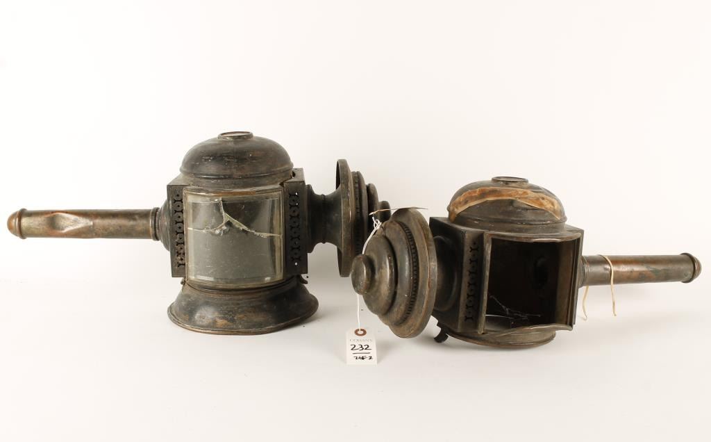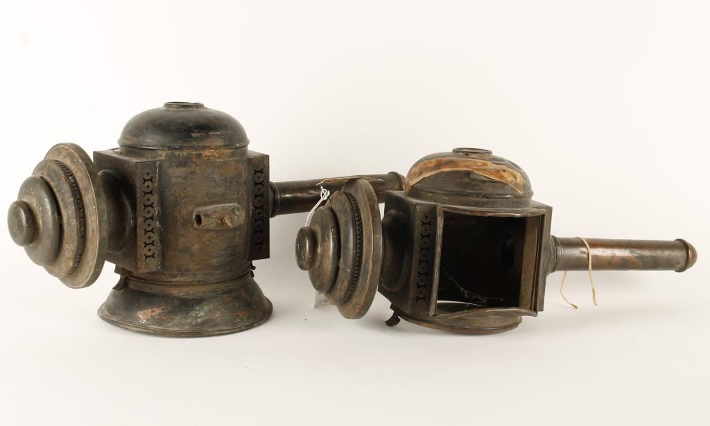 Lot 1027 Pair of old carriage lamps from the Col. William Orbelo estate with old label on one of the lamps