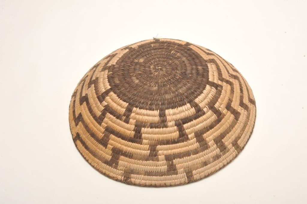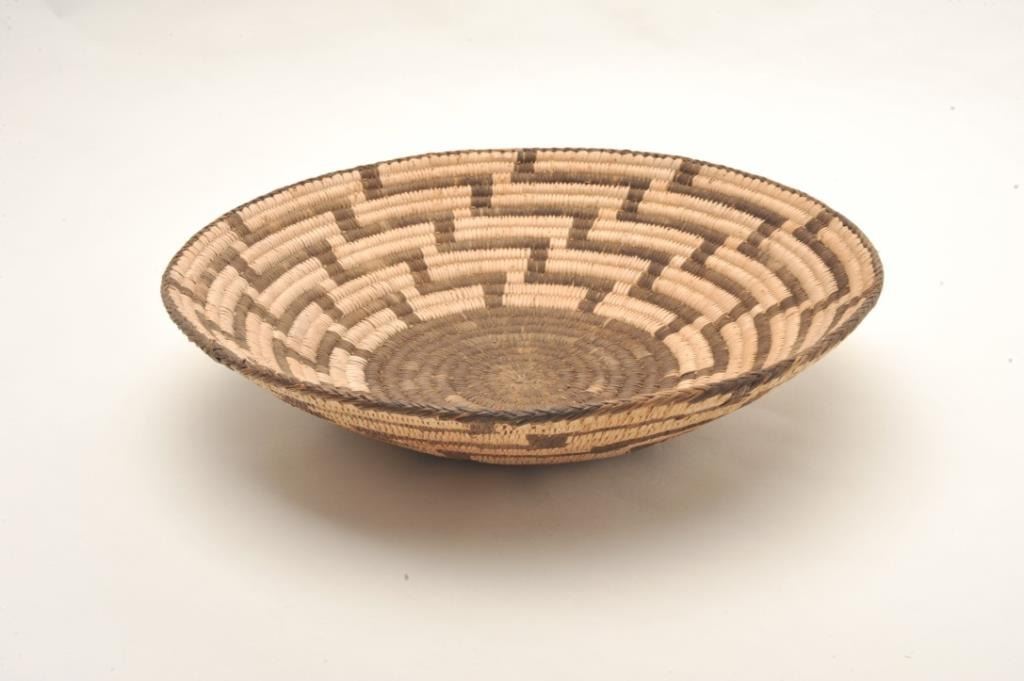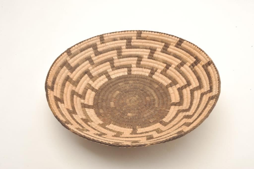Pima basket with alternating geometric designs circa early 1900's. Size 15 1/2 " across center. Near fine condition, rim intact. Est. $600-$1,200.