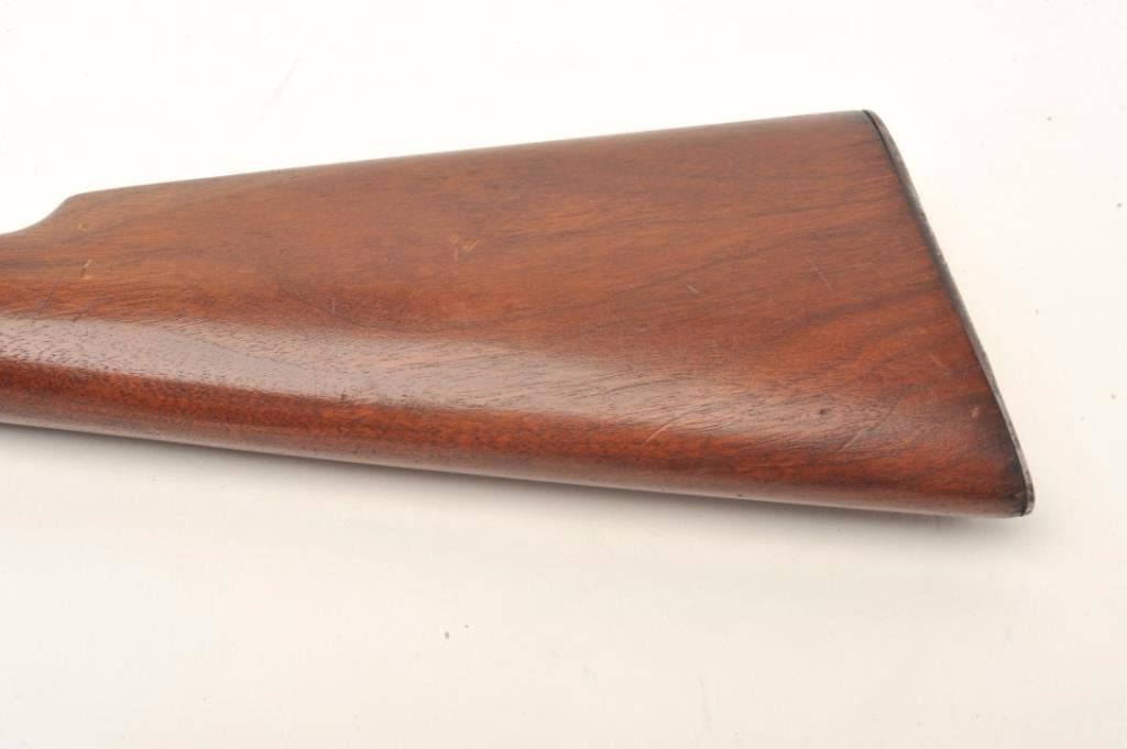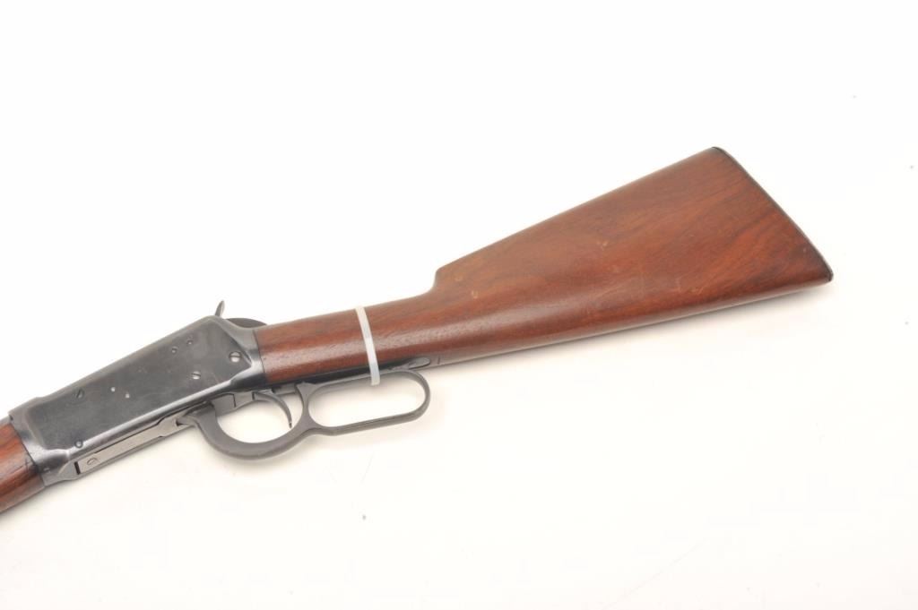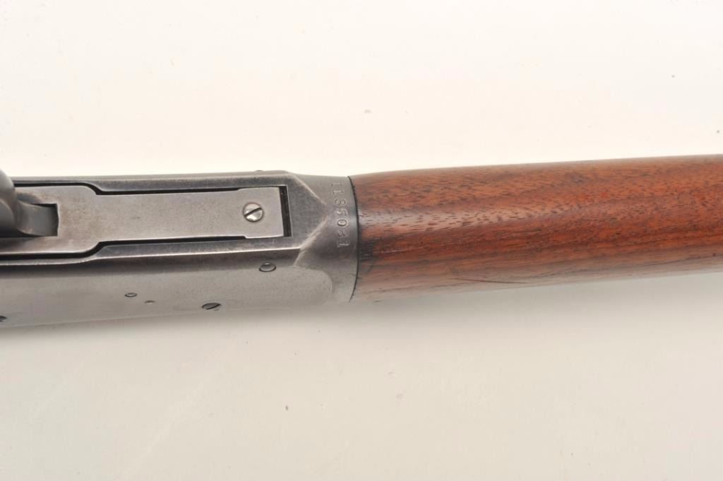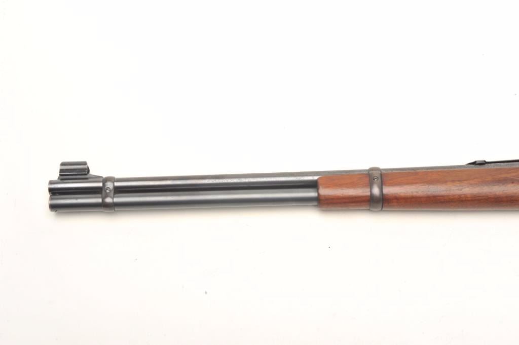 Winchester Model 94 carbine pre-war in .30-30 caliber, S/N 1135081. This rifle shows 90%-95% original blue with loses at the edges and minor scratches. Two tap holes in receiver for Lyman sight with plug screws.The wood is also very good plus with just minor scratches. A better than average 1937 made Winchester with great bore. (C&R) Est.: $500-$1000