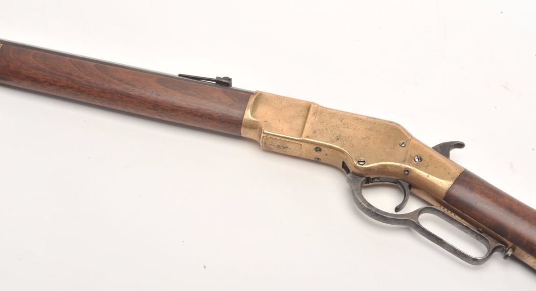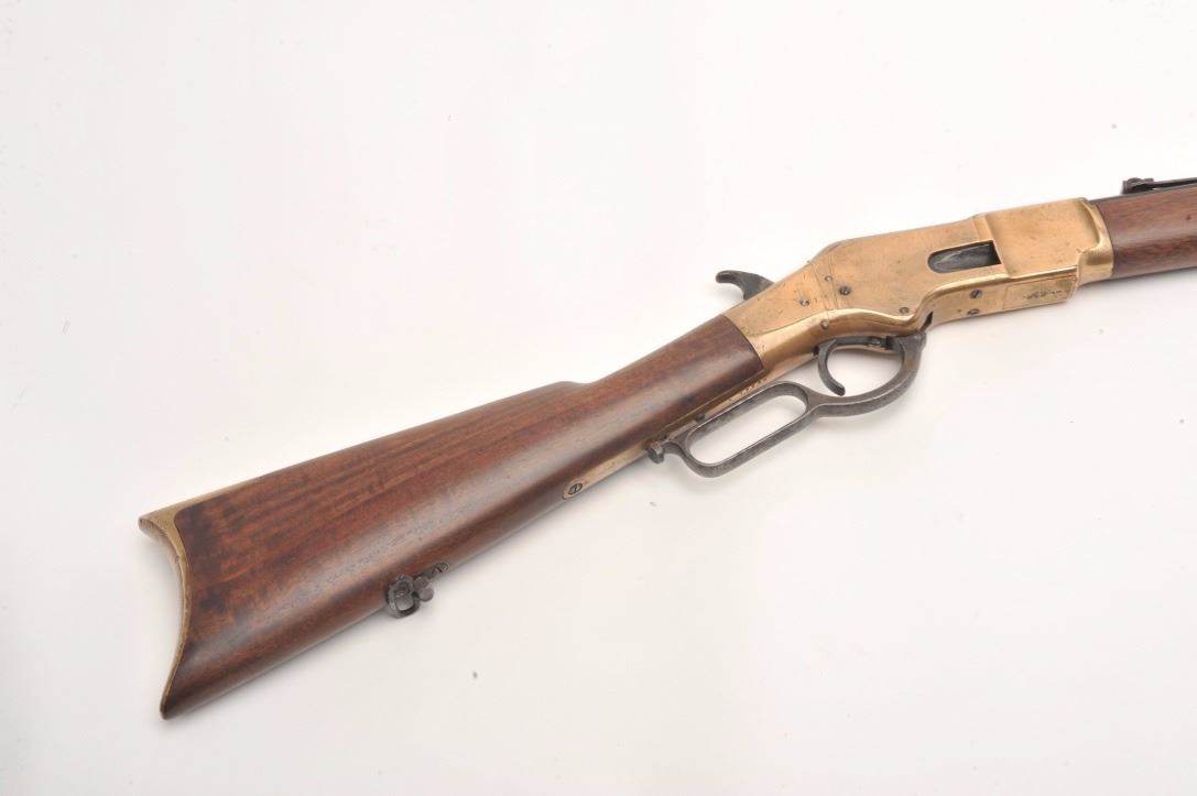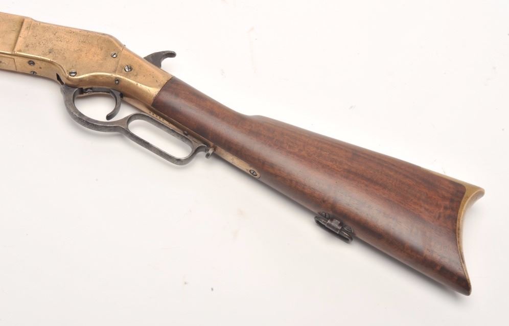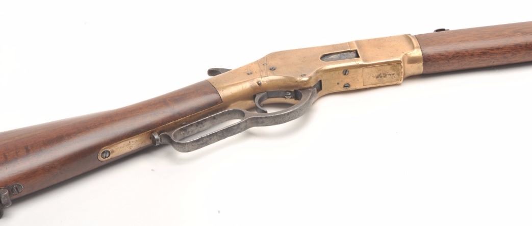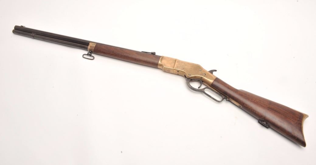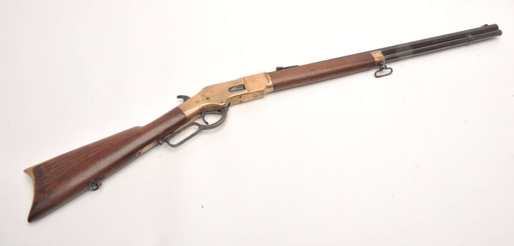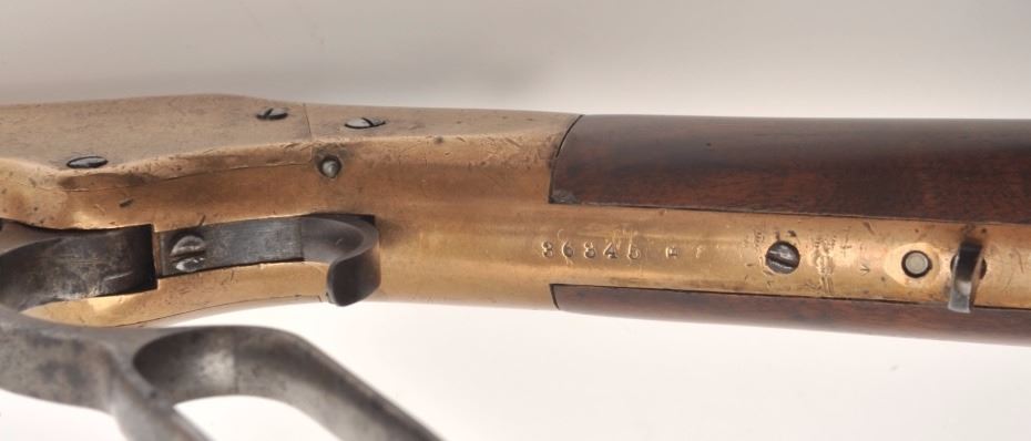 Winchester 1866 rifle in .44 rimfire caliber showing a octagon barrel, S/N 36245. Made in early western frontier era. This rifle shows brown patina on the frame with full address and good edges along with correct stylesights. Good frame with minor nicks and sling swivels. In good to very good condition overall with well restored stocks. The action is good and the bore is fair. These ’66 octagon barrel rifles were the firstWinchester to the frontier preceding the ’73. They have all but dried up at shows. (Antique) Est.: $6,000-$12,000