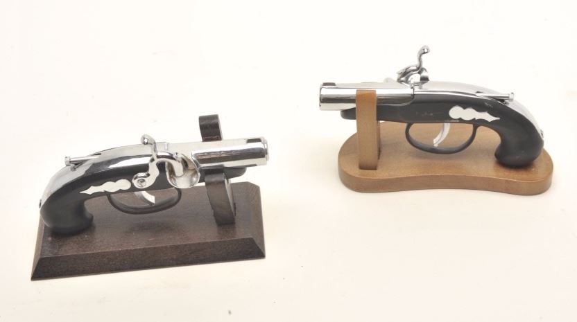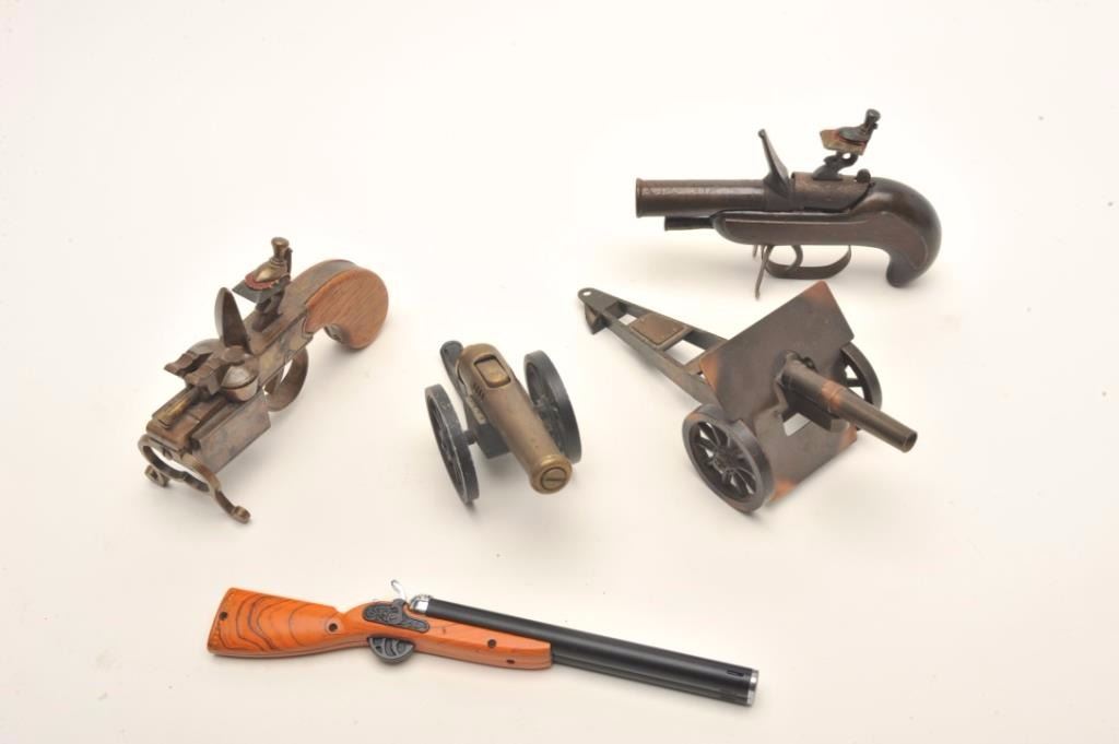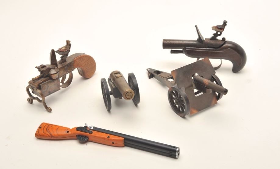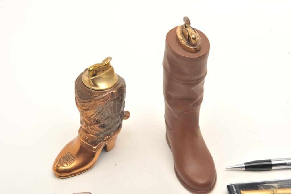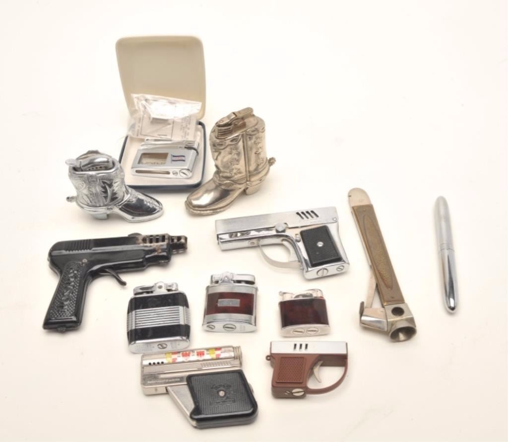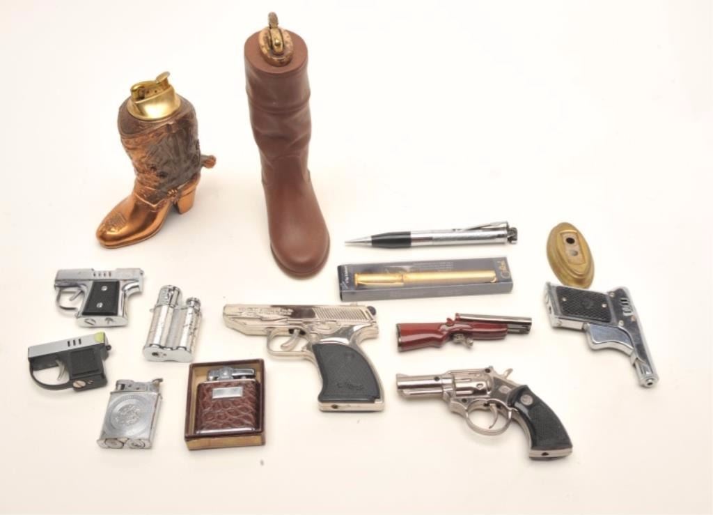 Misc. lot of vintage and collectible pocket lighters including a number in the form of pistols (some with boxes) and long guns; 3 desktop lighters in the form of cowboy boots; also some cannon desktop lighters plus more. (Reference: James Flanagan’s definitive work “The Big Book of Cigarette Lighters”). Est.: $600-$850.