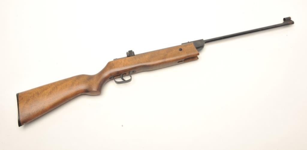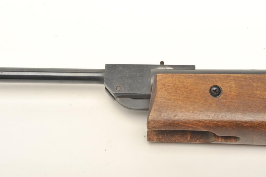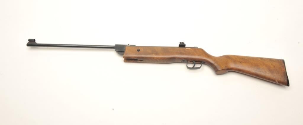 Norica Model 61 air rifle, .177 caliber, serial #G15038. The rifle is in good overall condition. The single cock, break action air rifle appears to function at the time of description. The barrel retains the majority of its blued finish with moderate surface rust at the muzzle. The receiver has a Beeman peep sight added. The smooth wood stock is in good condition with small mars and handling marks. The butt stock ends with a plastic butt plate. Est.: $50-$100.