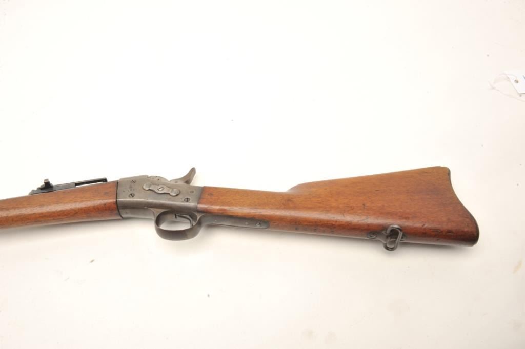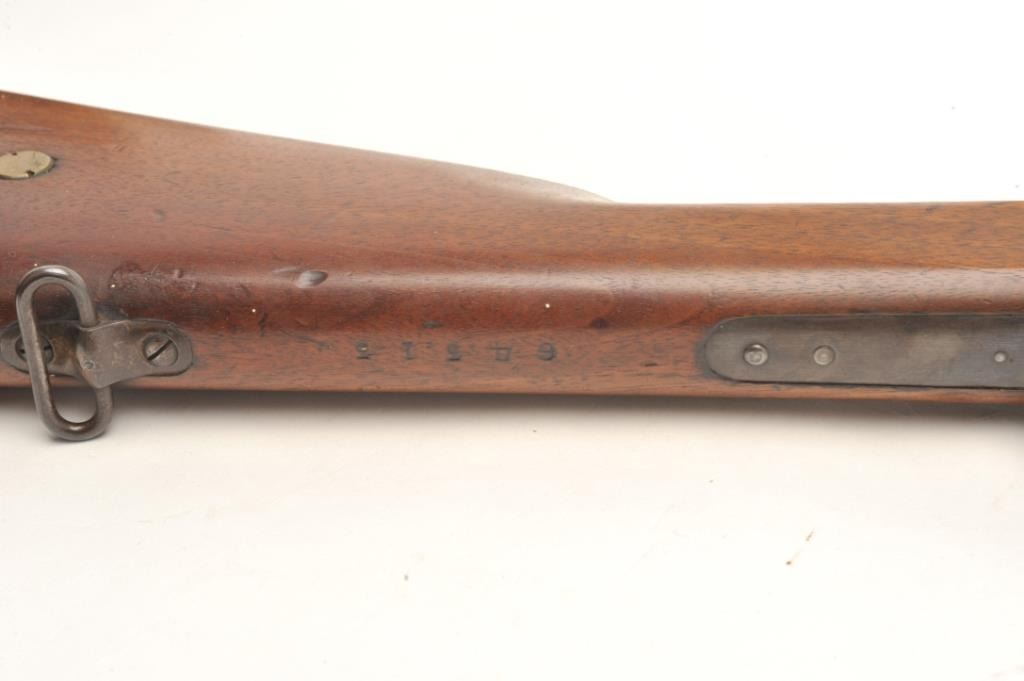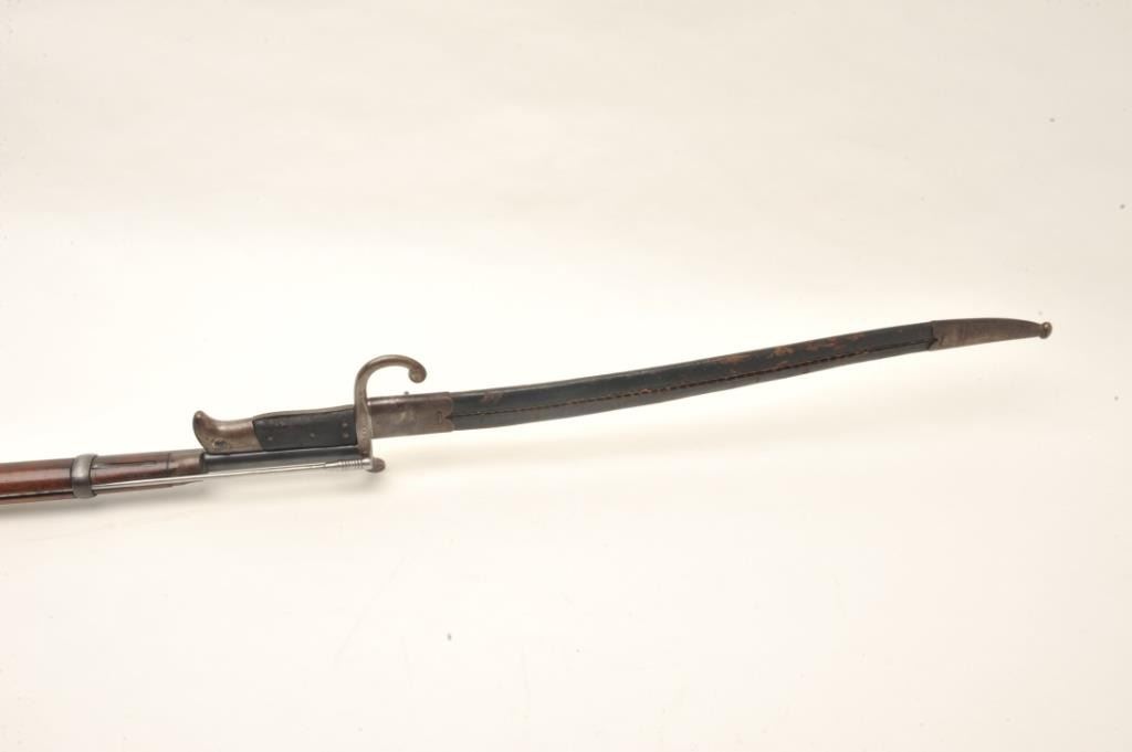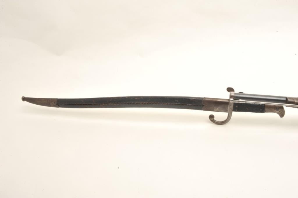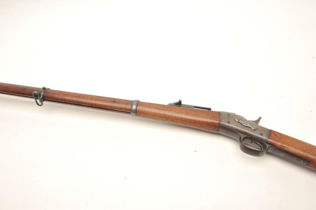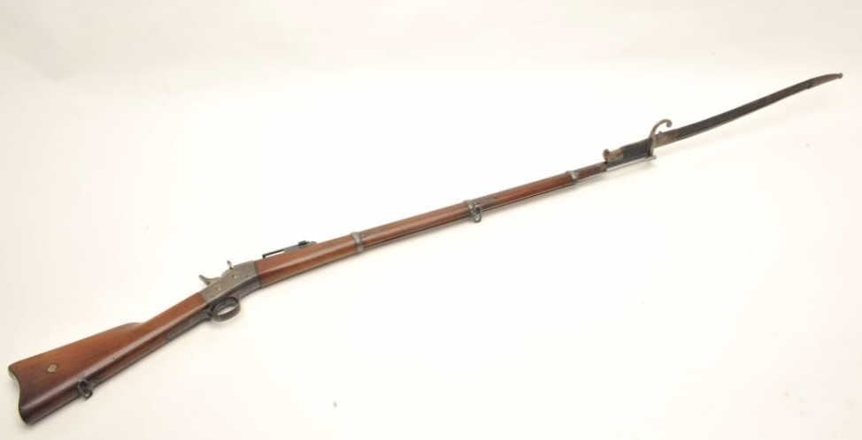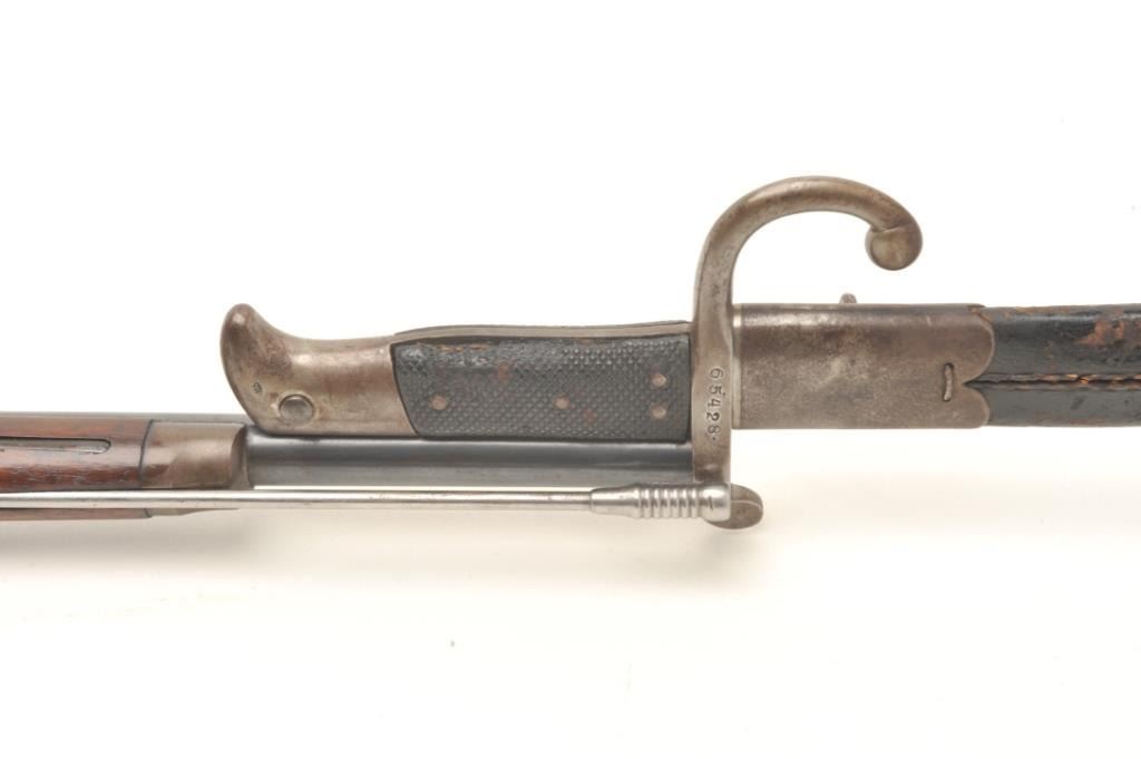 Norwegian Rolling Block Rifle in 10.5mm remaining in near fine as issued condition with sabre bayonet, scabbard and cleaning rod, S/N 64313. This rifle shows 75%-85% original thinning and toning blue and casecolors. Near fine wood showing inspection marks with just minor storage dings and normal aging. The bore is excellent and the bayonet is near fine and Solingen marked. (Antique) Est.: $500-$1000
