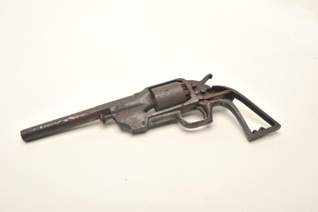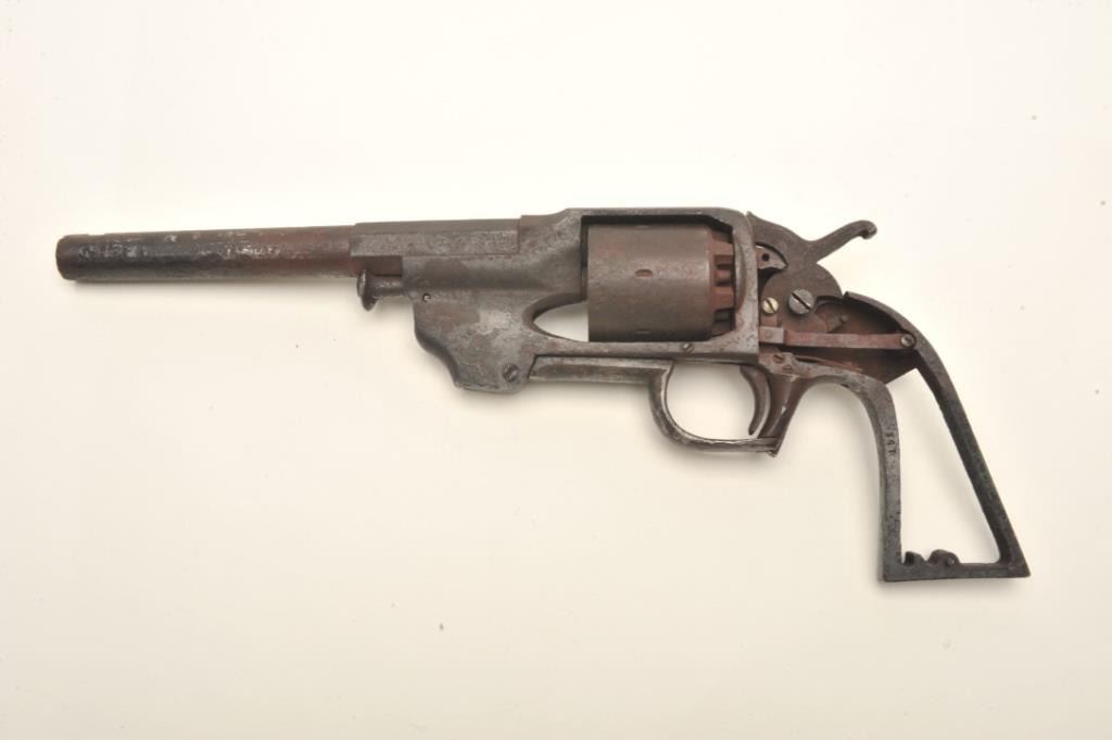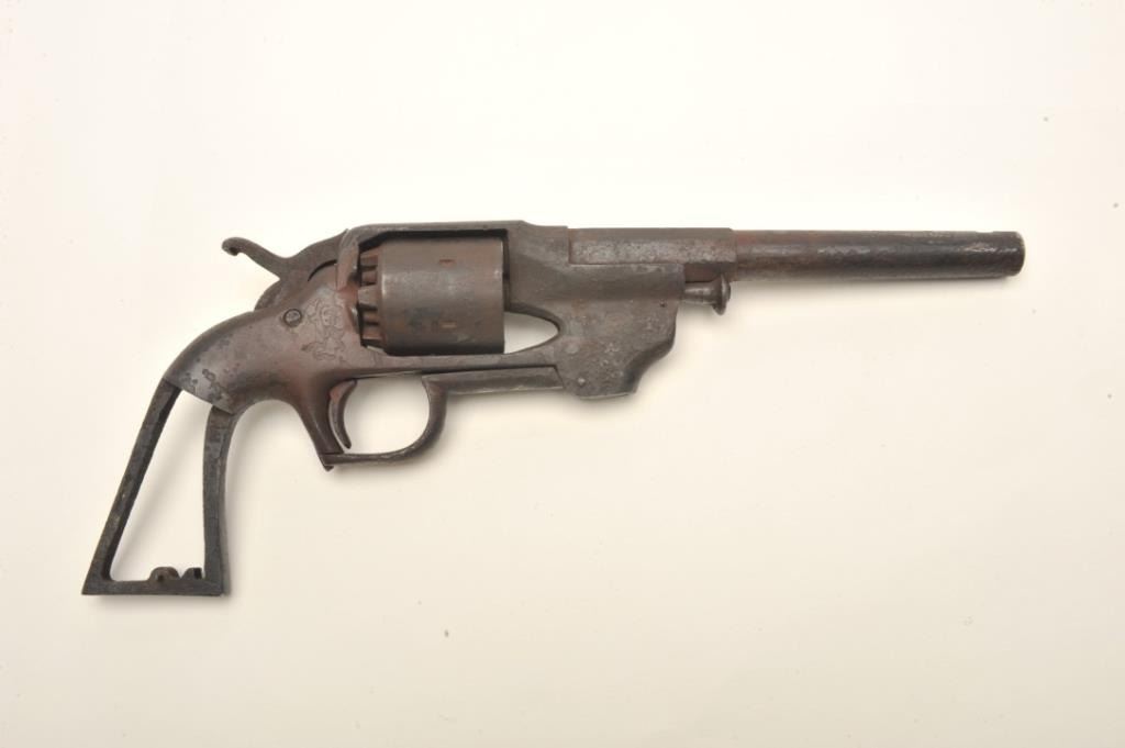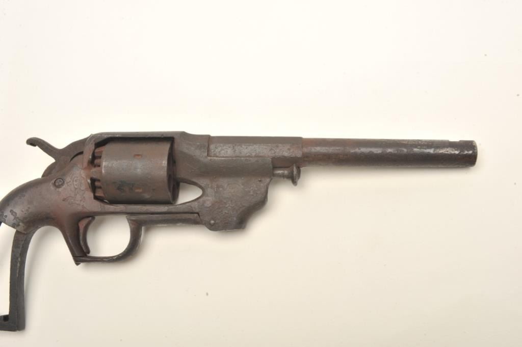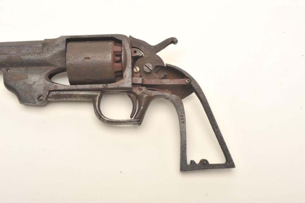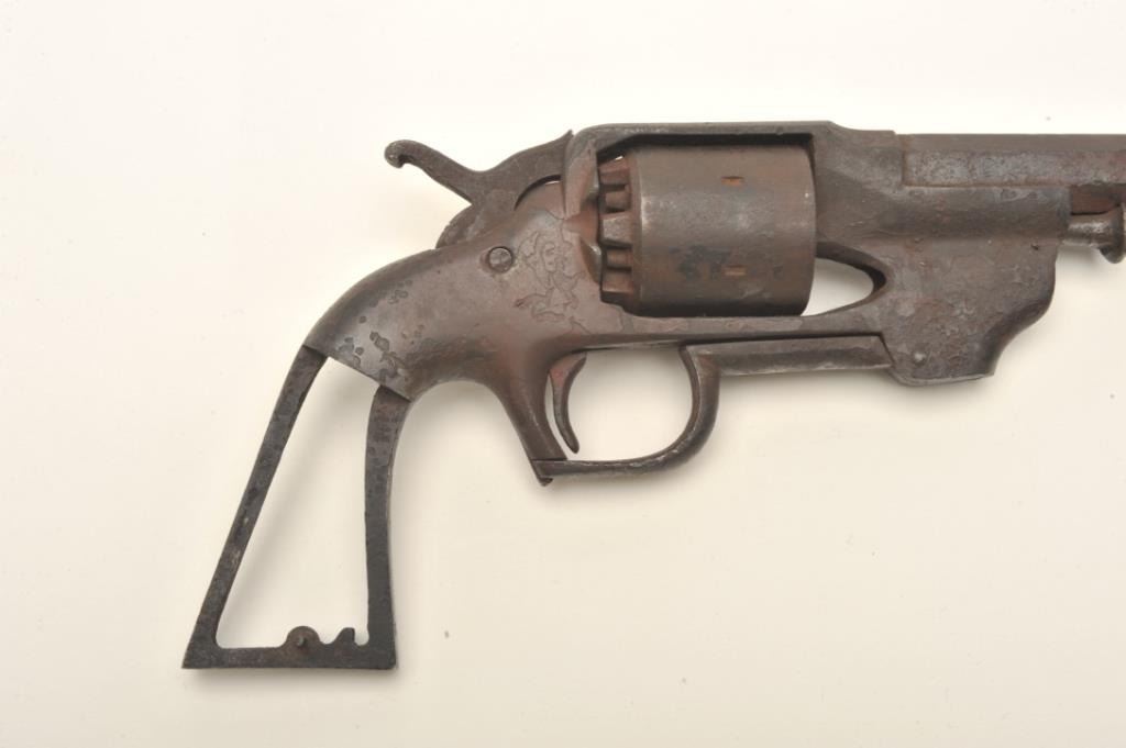 Rusty relic Allen & Wheelock percussion pistol, S/N 347, missing grips and side plate; if only this one could talk! A great wall hanger. (Antique). Est.: $300-$600.