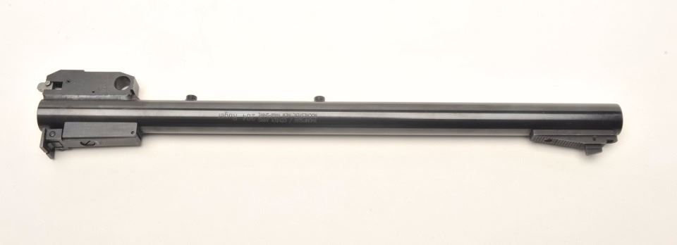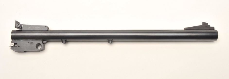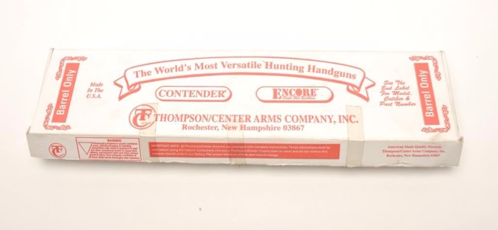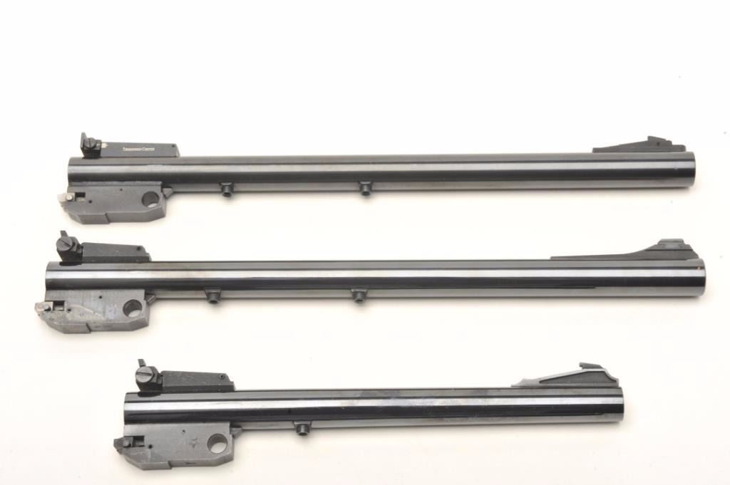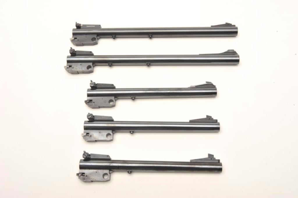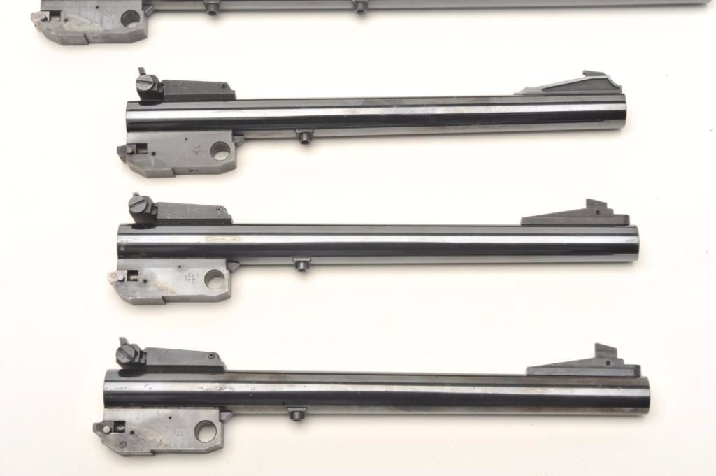 Thompson Center Contender, #206873, 6 barrel set: 14" .17 HMR, 10" .22 LR, 14" .204 Ruger, 14" .223, 10" .44 Mag., 10" 7mm TCU. Very good to excellent condition, showing very little use. Bores are excellent. Est.$500-1000. (Modern, PPT)