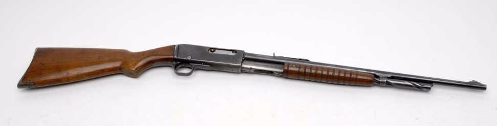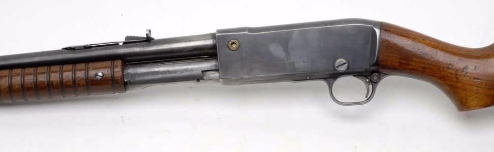 Remington Model 14 pump action rifle, .32 Rem. caliber, 22” round barrel, S/N 96261, blued finish, wood stocks in overall good to very good condition with considerable original muted blue finish on metal surfaces, good bore, very good markings, crisp action and good wood stock with scattered old mars and scratches from carry and storage. (C&R/PPT). Est.: $300-$600.