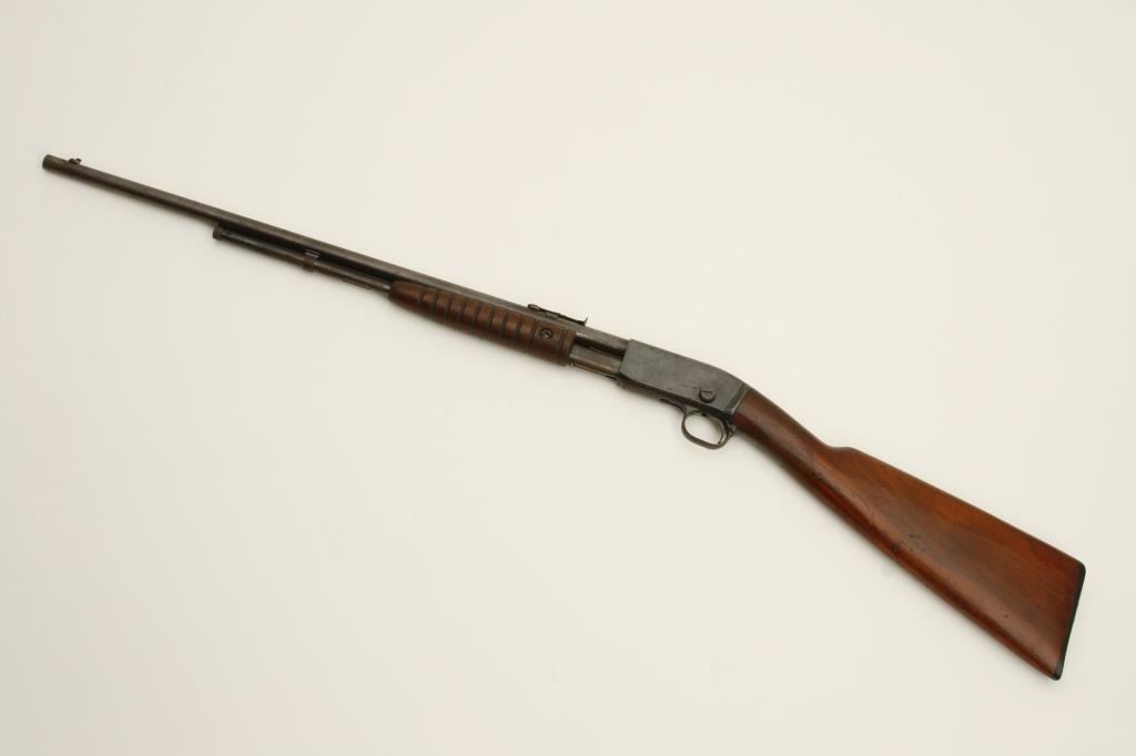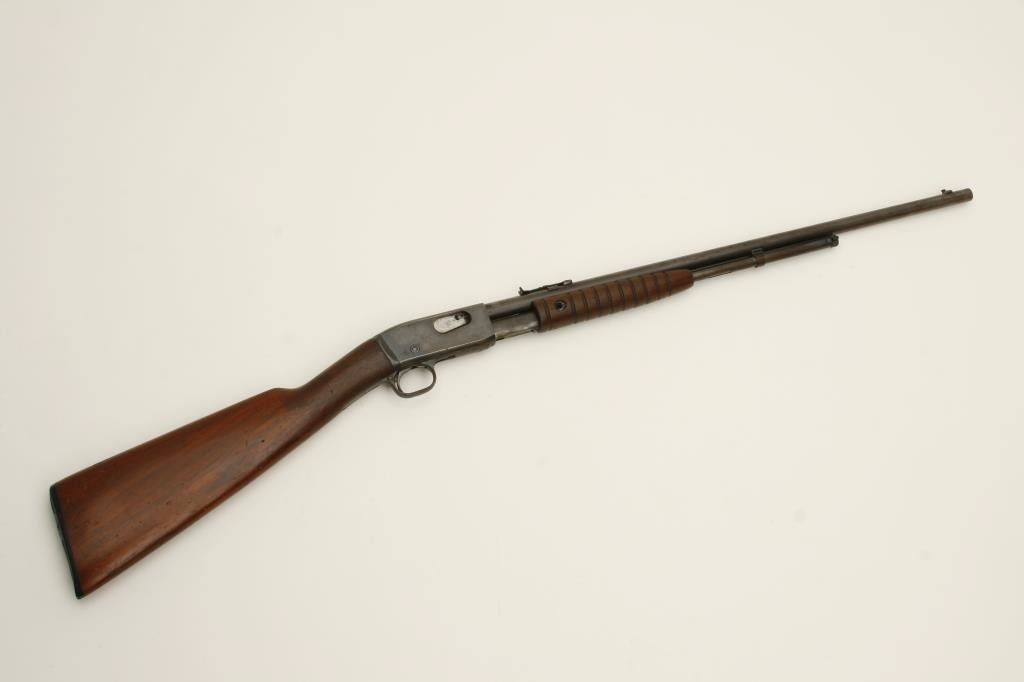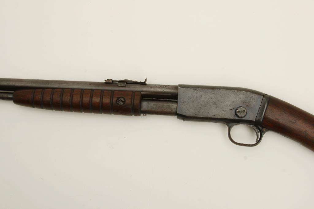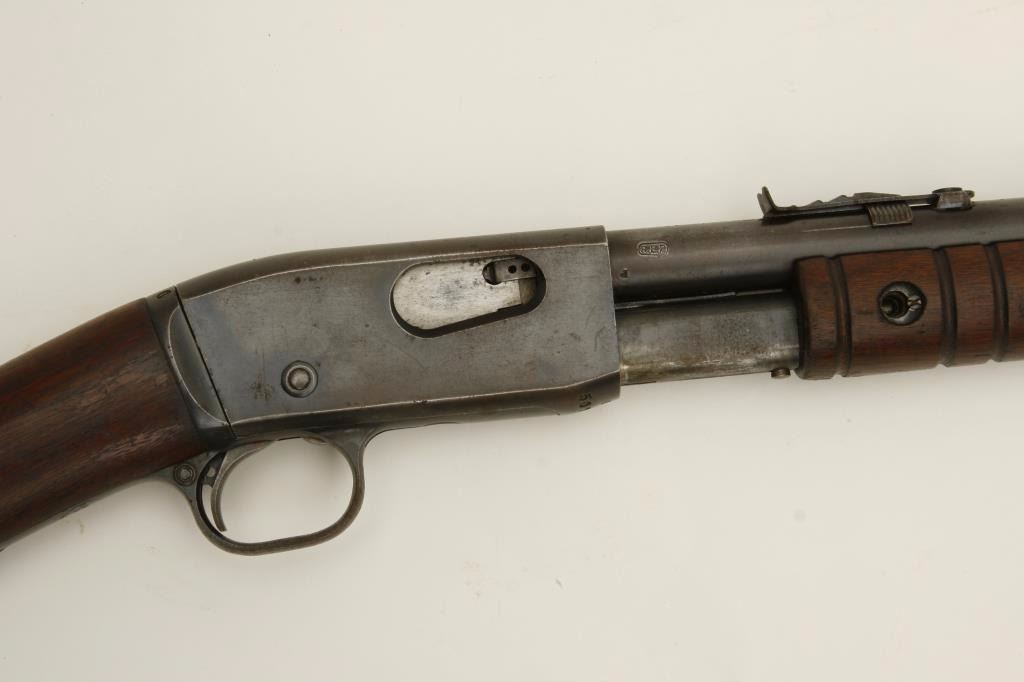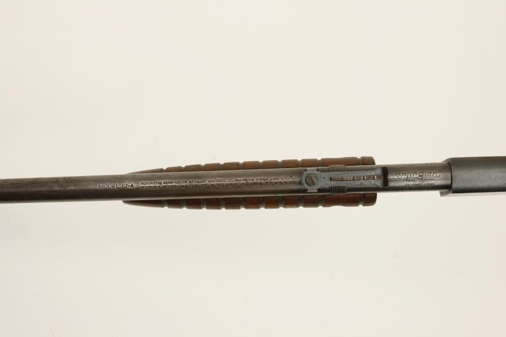 Remington Model 12-A Takedown pump action rifle, .22 Short, Long or Long Rifle caliber, serial #507977. The rifle is in good overall condition with a 22” barrel. The barrel and receiver retain the majority oftheir thinning blued finish. The smooth wood stocks show use but remain in good condition with mars and compressions consistent with field use. The butt stock ends with a plastic, Remington marked butt plate. Thebore is good, the action is crisp and markings are sharp. (Modern) Est.: $125-$250.
