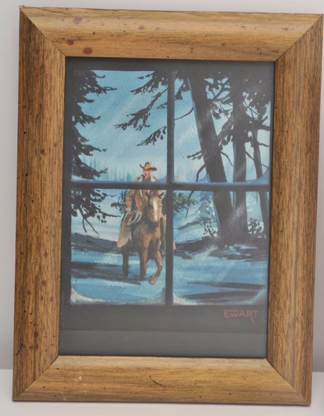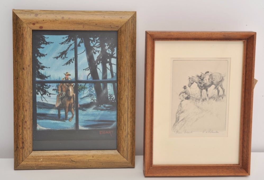 Small etching of cowboy and mount entitled “Man’s Friend, R.H. Palenska” signed lower right in pencil. Measures 4 ¼” x 3” along with miniature water color signed lower right Ewart and measures 6 ½” x 4 ½”. Framed andin fine condition. Est.: $150-$300