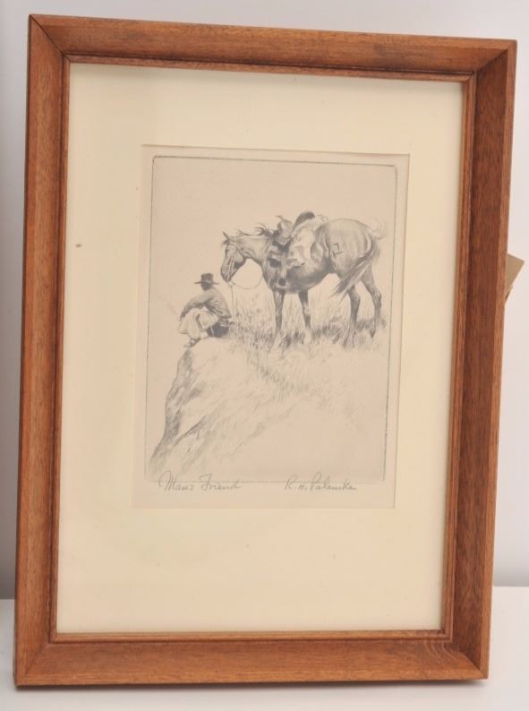 Lot 1243 Small etching of cowboy and mount entitled “Man’s Friend, R.H. Palenska” signed lower right in pen