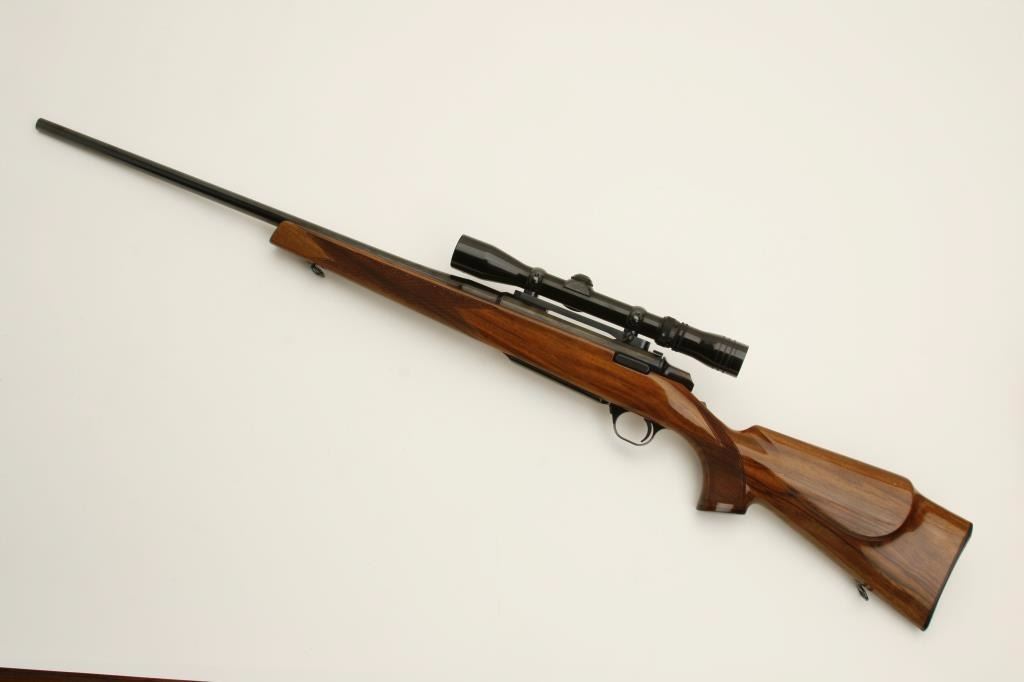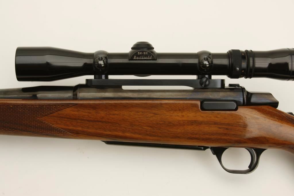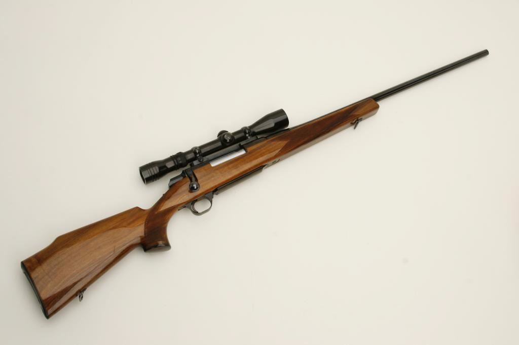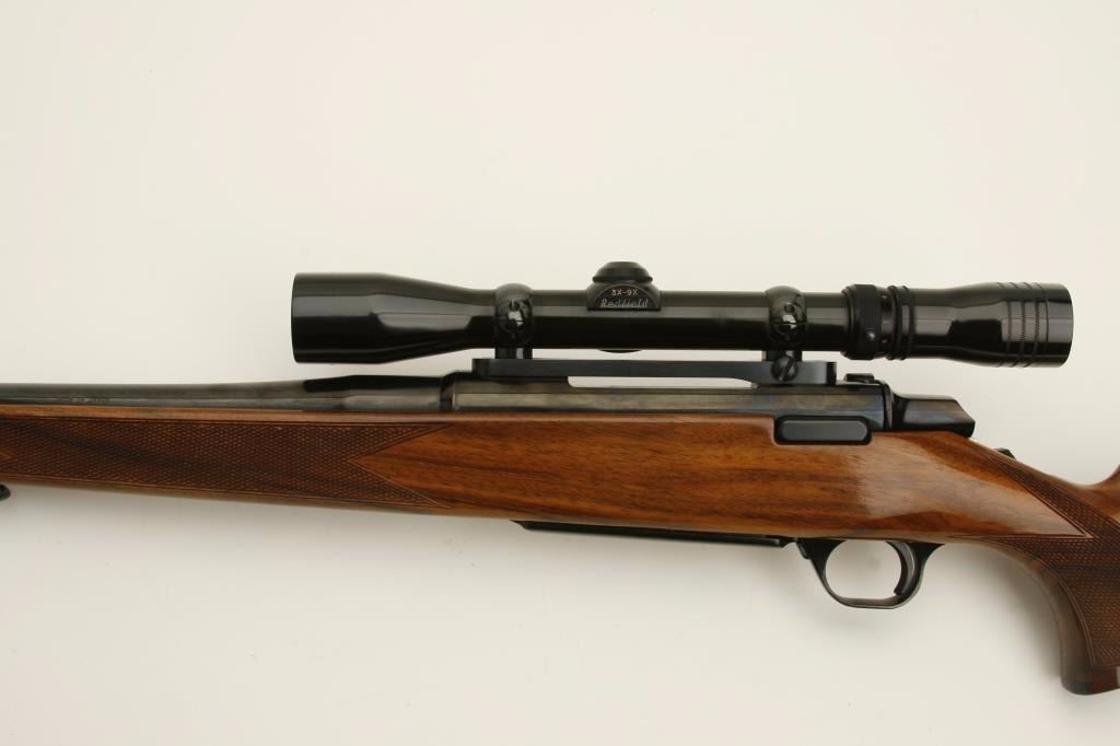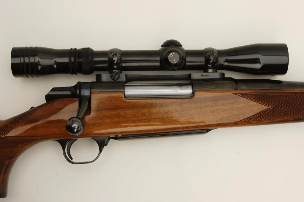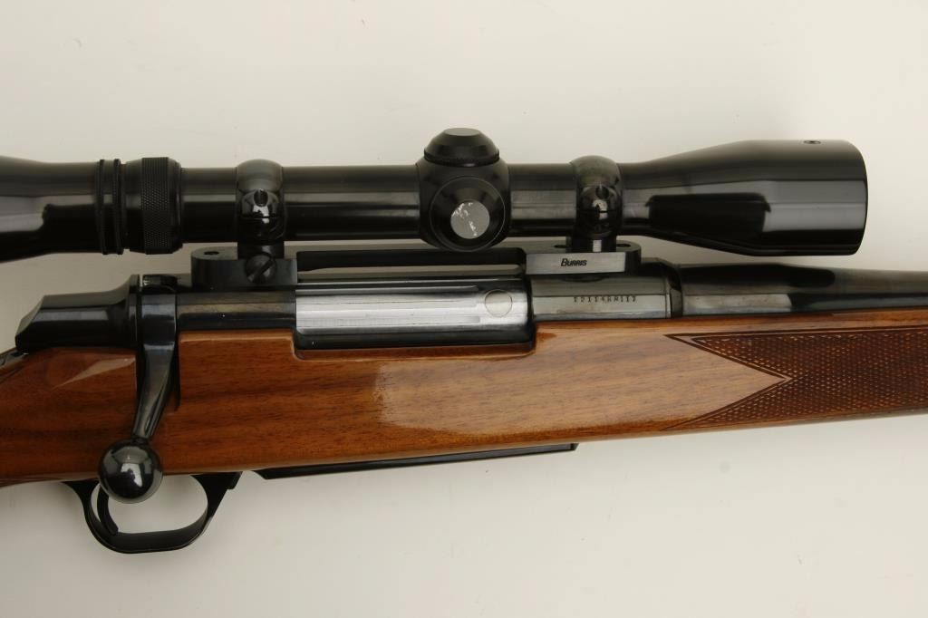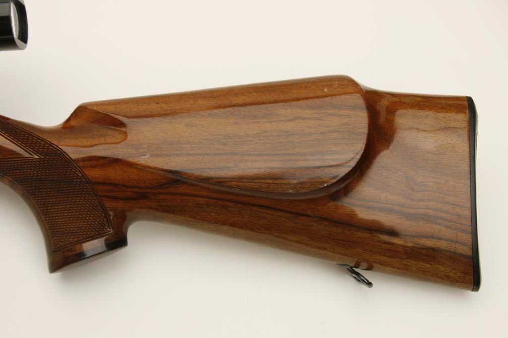 Browning bolt action rifle, .270 Win. Caliber, serial #12114RN117. The rifle is in very good overall condition with a 24” barrel. The barrel and receiver retain the majority of their glossy blue finish with aslight loss at the muzzle and light scratches on the magazine base plate. The finely checkered walnut stocks are in good condition with mars and scratches from field use. The butt stock has dramatic figure to the woodand a Browning marked plastic butt plate. The bore is very good, the action crisp and markings are sharp on this nice Browning bolt gun. (Modern) Est.: $275-$550.