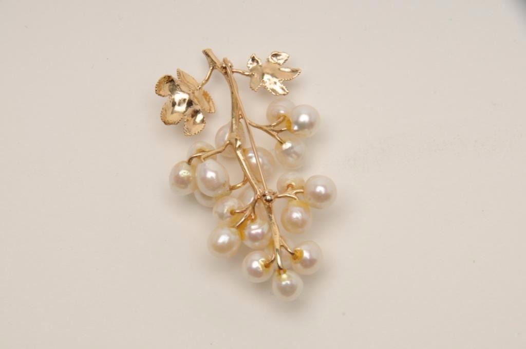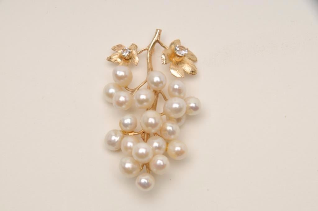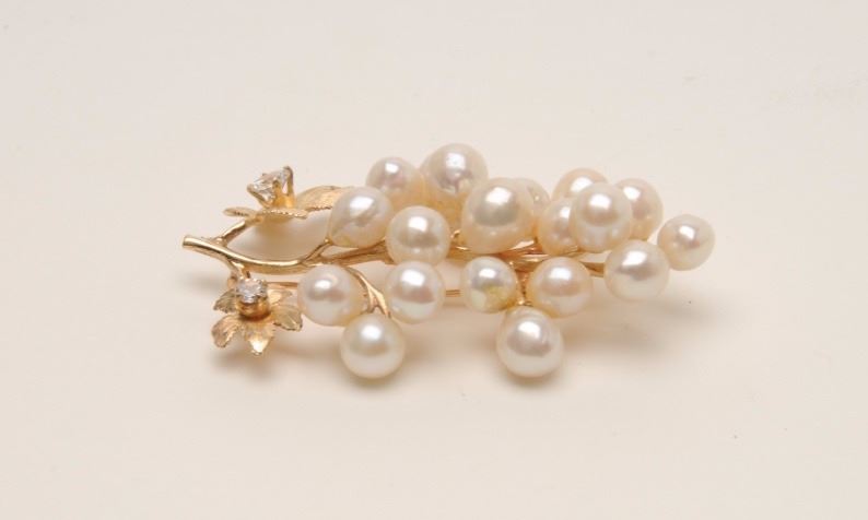 Lot 1295 Vintage pearl broach in 14K with two fine diamonds circa 1950’s. Superb pearls possibly natural. E