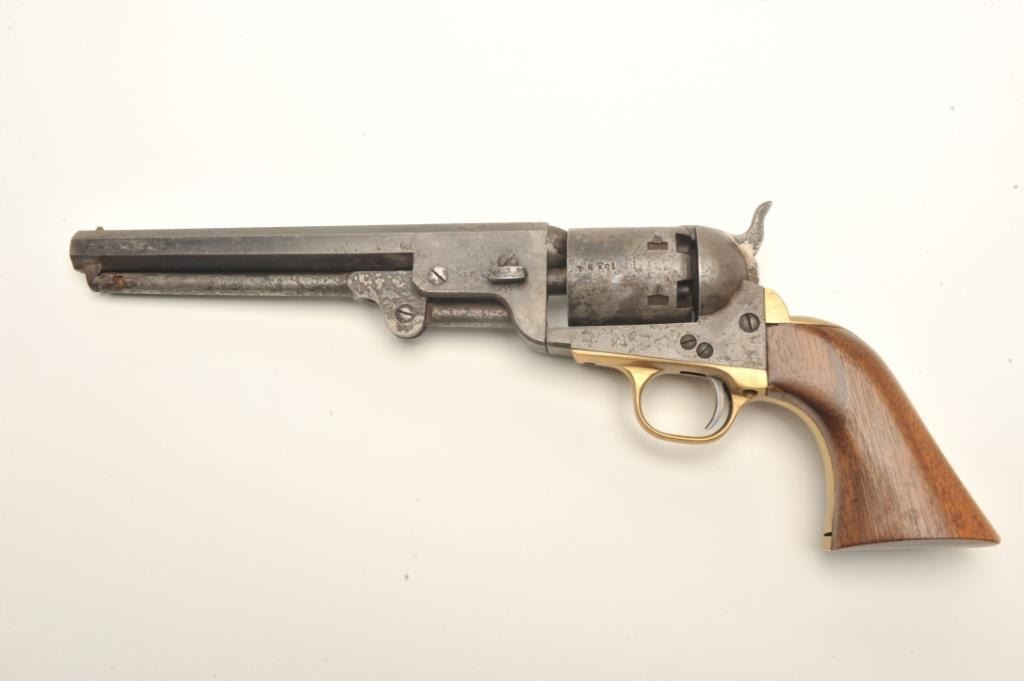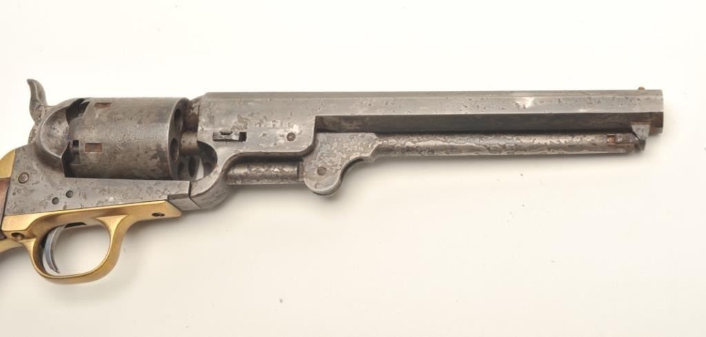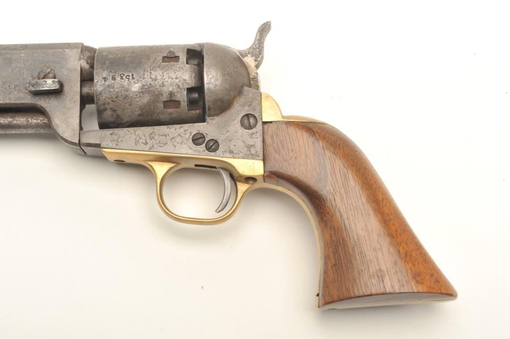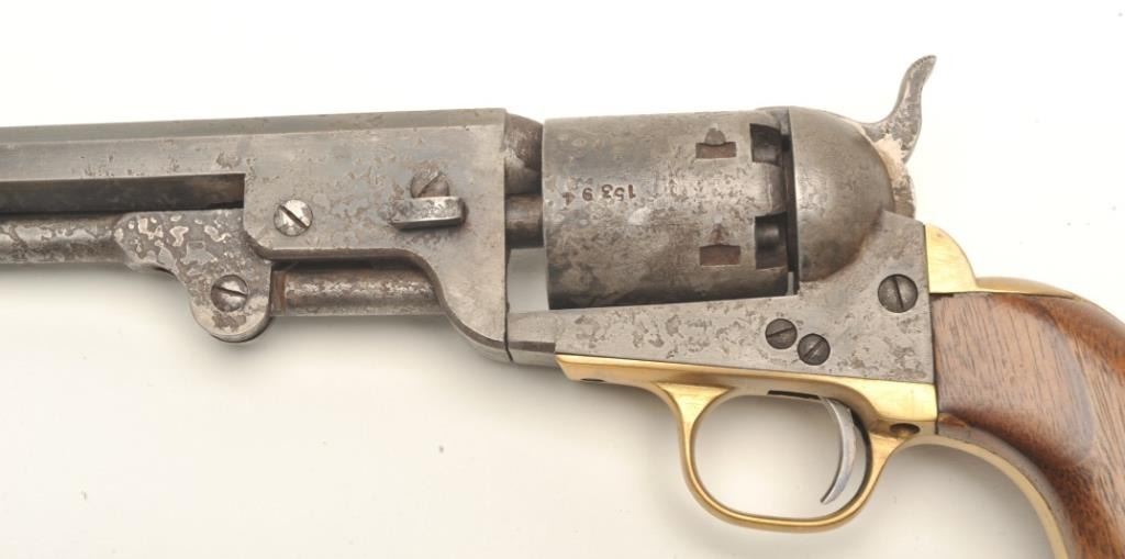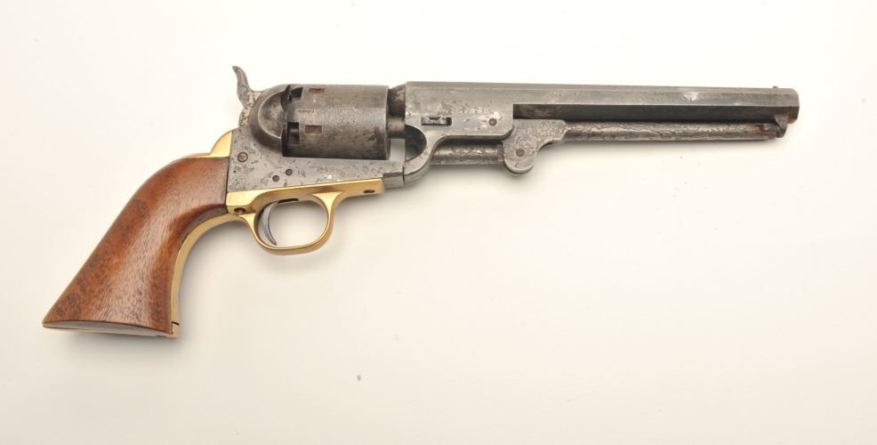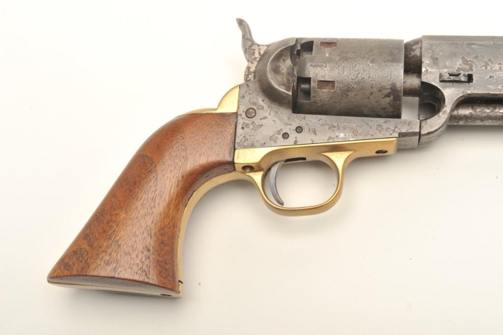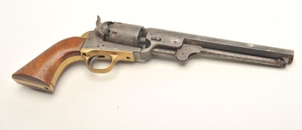 Modern reproduction of a Model 1851 percussion revolver, .36 caliber, 7.5” octagon barrel, brass straps, wood grips, S/N 15394; overall good condition with crisp action, good grips, no other markings beyondserial number on cylinder, dark artificially aged iron parts. (percussion). Est.: $150-$300.