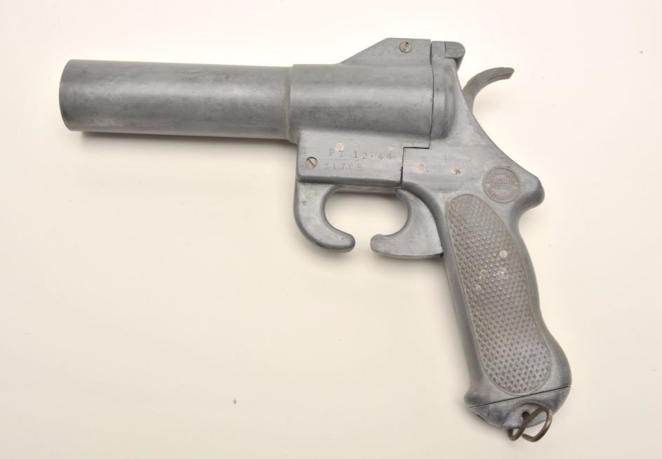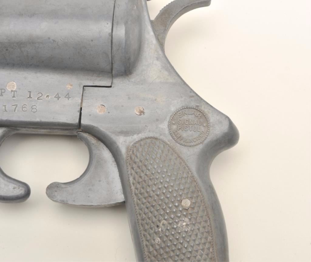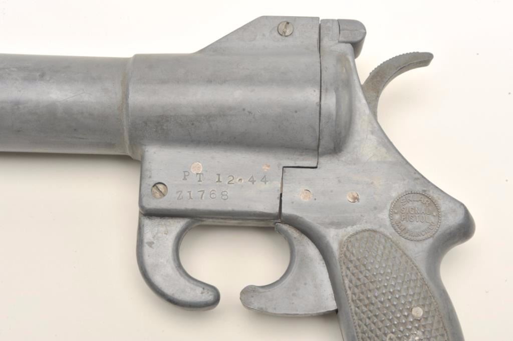 U.S. Sklar WW II Signal pistol, approximately 11” overall, appears to be of zinc construction, S/N Z1768, in overall good condition with good action, also marked on left side of frame “PT 12 * 44”. Est.:$100-$200.
